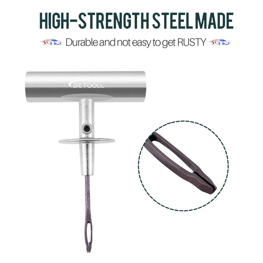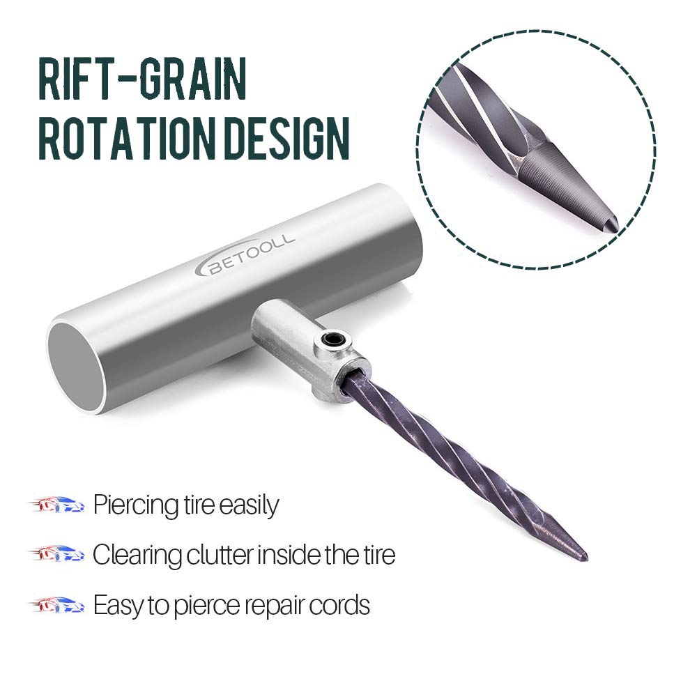 Q: How do I use the BETOOLL Tire Repair Kit?A: Using the BETOOLL Tire Repair Kit is simple. First, locate the puncture on the tire. Use the T-handle spiral probe tool to clean out the puncture. Next, insert the self-vulcanization repair plug using the T-handle insert tool. Finally, follow the instructions provided in the kit for detailed steps and safety tips.