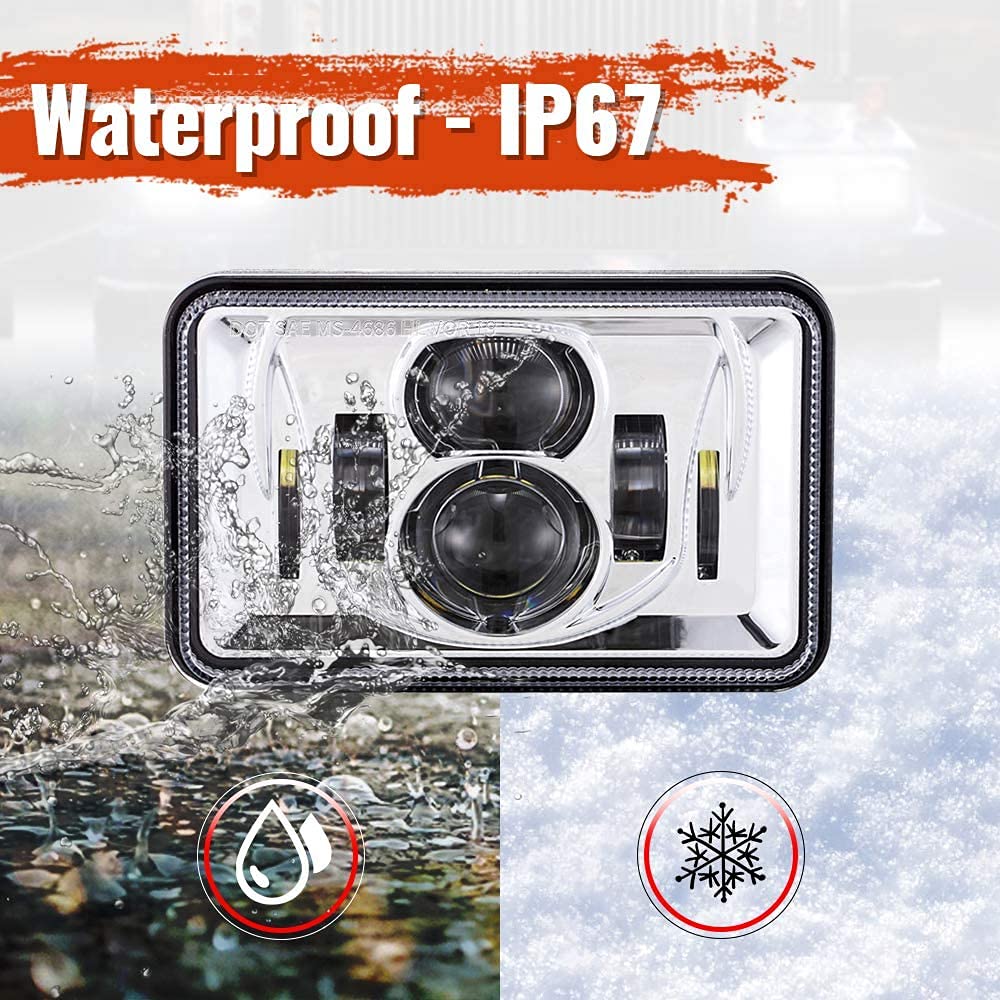 Why Choose BICYACO LED Headlights? Light up your own pathMade with Super bright LED chips, real 60W output brightness without spots, the perfect cut-off line is sharp and straight, will NOT blind others' eyes while providing the brightest and widest vision. Plug n play-20 MIN Package comes with all the parts required to make the headlights work, you just need 20 minutes to install the headlamp, and super fast to get everything done. Professional-grade durability Its rugged construction includes a shatter-resistant polycarbonate housing and IP67-rated resistance to water and dust intrusion,leading you to enjoy intensely effective illumination.Specifications:Power:60wattLEDs:Made with LED chips Color temperature: 6000K-6500K Lumens: high beam 3600 lumens per light / low beam 2800 lumens per light Housing Material :Aluminum Alloy Lens Material:PCWork Temperature: from -40C to +85C Waterproof : IP67Lifetime: more than 50,000 hours Measurement: 6.7x 4.33 x3.15 inch Adapter: H4 Certificate: DOT SAE E-mark Fit for:Any vehicles with 4X6 inch headlight like: Compatible with Kenworth T800 T400 T600 W900B W900L Classic 120/132 HK Classic Compatible with Feightliner fld 120 112 Compatible with Peterbilt Rectangular Headlights 379 378 357Compatible with Chevy K5 K10 K20Compatible with Trans Am