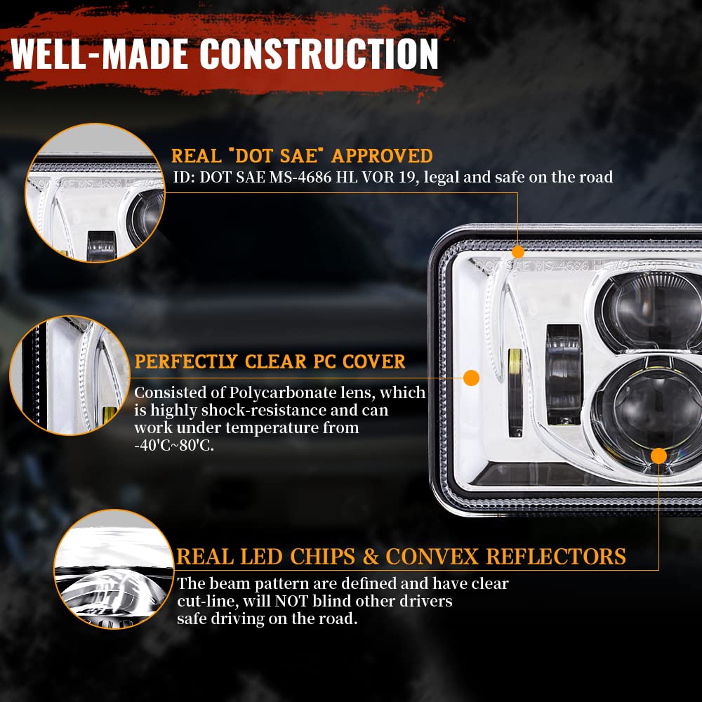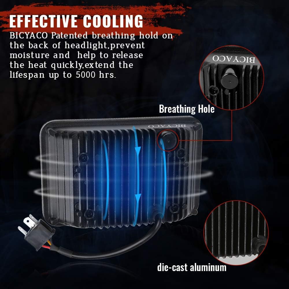 Why Choose Bicyaco Led Headlights? Light Up Your Own Pathmade With Super Bright Led Chips, Real 60W Output Brightness Without Spots, The Perfect Cut-Off Line Is Sharp And Straight, Will Not Blind Others' Eyes While Providing The Brightest And Widest Vision. Plug N Play-20 Min Package Comes With All The Parts Required To Make The Headlights Work, You Just Need 20 Minutes To Install The Headlamp, And Super Fast To Get Everything Done. Professional-Grade Durability Its Rugged Construction Includes A Shatter-Resistant Polycarbonate Housing And Ip67-Rated Resistance To Water And Dust Intrusion,Leading You To Enjoy Intensely Effective Illumination.Specifications:Power:60Wattleds:Made With Led Chips Color Temperature: 6000K-6500K Lumens: High Beam 3600 Lumens Per Light / Low Beam 2800 Lumens Per Light Housing Material :Aluminum Alloy Lens Material:Pcwork Temperature: From -40C To +85C Waterproof : Ip67Lifetime: More Than 50,000 Hours Measurement: 6.7X 4.33 X3.15 Inch Adapter: H4 Certificate: Dot Sae E-Mark Fit For:Any Vehicles With 4X6 Inch Headlight Like: Compatible With Kenworth T800 T400 T600 W900B W900L Classic 120/132 Hk Classic Compatible With Feightliner Fld 120 112 Compatible With Peterbilt Rectangular Headlights 379 378 357Compatible With Chevy K5 K10 K20Compatible With Trans Ampackage Includes:4 Pcs 4X6Inch 60W Rectangular Led Projector Headlight.1 Pcs H4 9003 Hb2 Wiring Hardness 1 Pcs Instruction