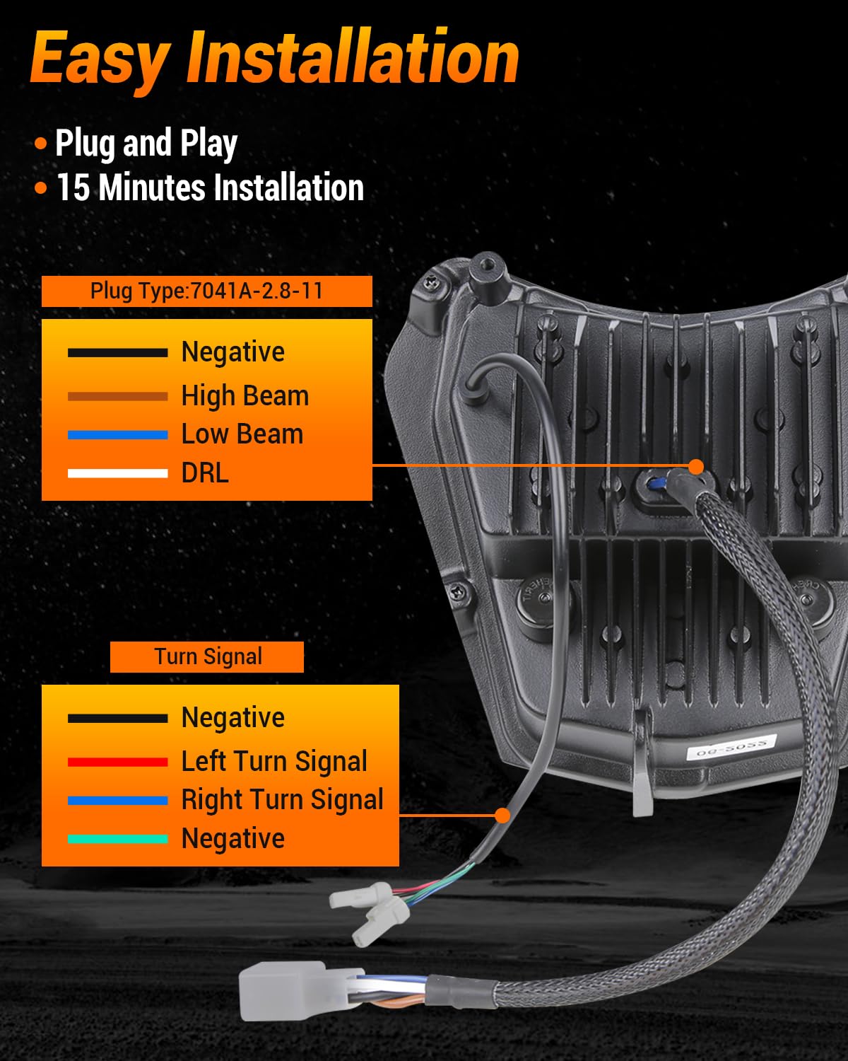 Descriptions Product Name: LED Dirt Bike Motorcycle Headlight Height: 143mm / 5.63 inch Width: 164mm / 6.46 inch Depth: 119mm / 4.69 inch Color Temperature: 6500K (pure white) Power: 66W@High Beam, 36W@Low Beam Brightness: 3000lm@High Beam, 2000lm@Low Beam Daytime Running Light: 2W Working Voltage: 12V DC Outer Lens Material: PC Housing Material: Die-cast Aluminum Housing Color: Black Waterproof: IP67 Certification: DOT / ECE Wiring Harness: Not Included Fitment 2017-2021 EXC XCW 250 350 450 500 2014-2019 SX SXF 125 2019-2022 SMC R 690 Most of Enduro and Dirt Bike Motocross Supermoto Package Includes 1pcs LED Dirt Bike Headlight With Daytime Running Light