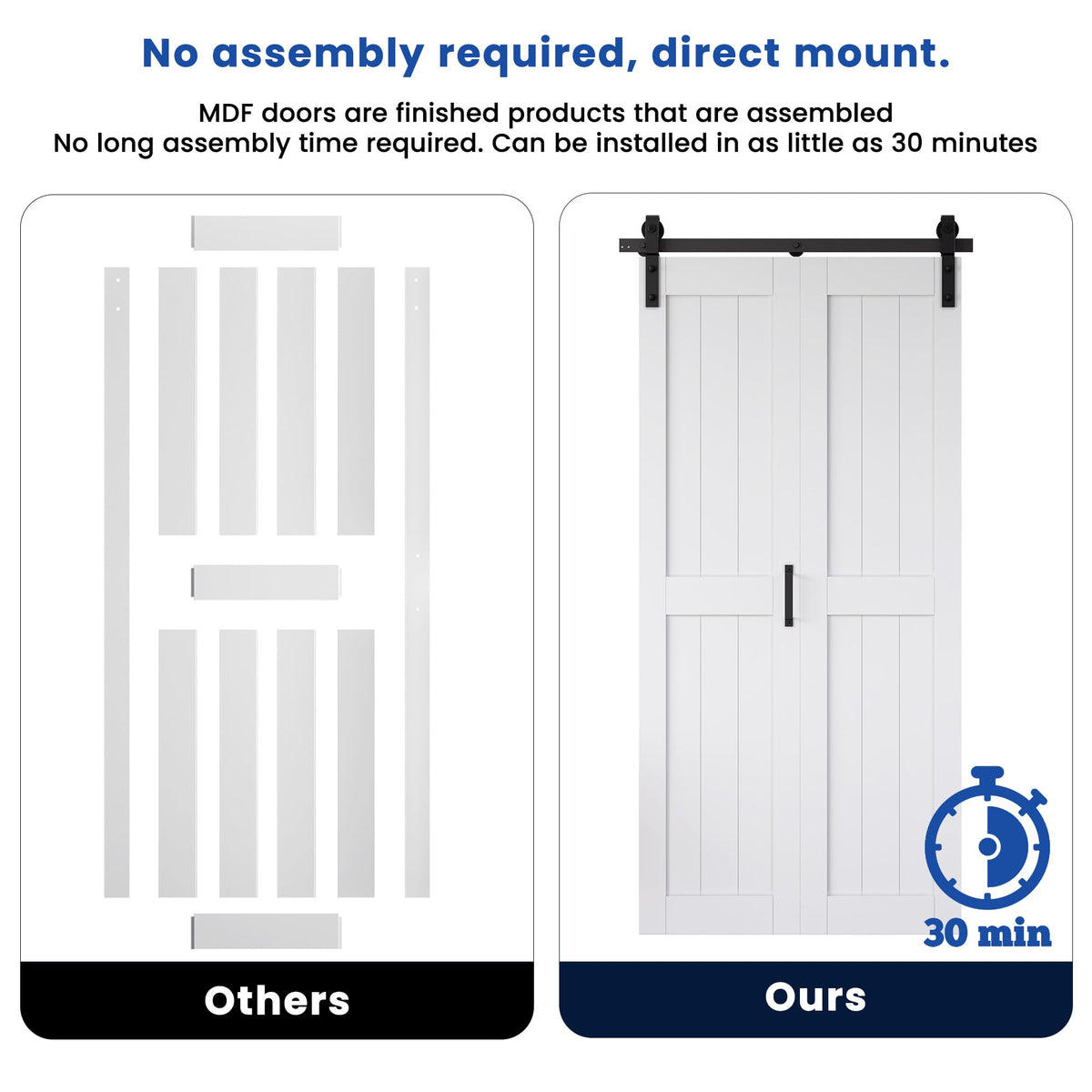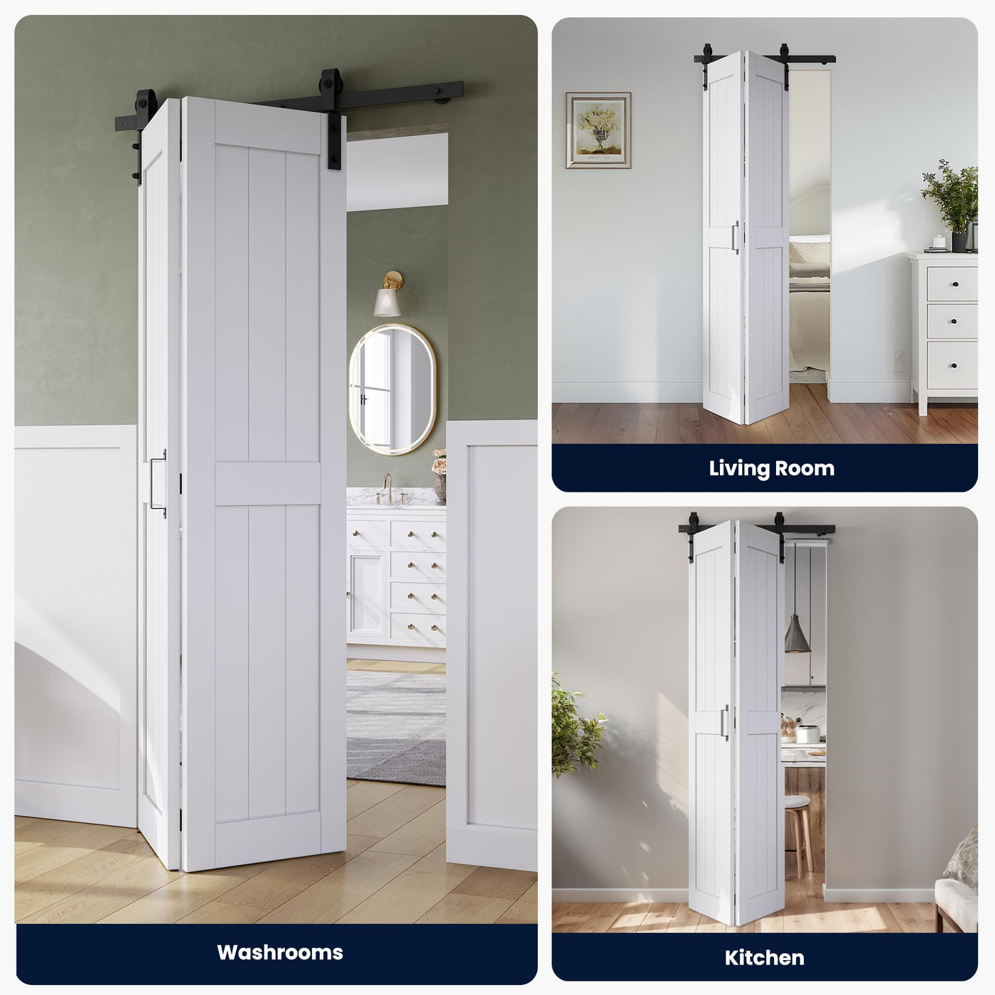 [Save Space ] The bifold barn door offers unique functionality and space-saving opportunity. The panels slide and fold as you open the door, can save more than 50% of space and can be widely used on each space. | [Easy Installation] The 28x84 barn door is pre-drilled and ready for installation. And the package contains the tools required for installation and detailed instruction to ensure ease of assembly. | [Product Dimensions] 28X84 bi-fold sliding barn door is made of 2 door panels size: 14'W x 84'H, thickness: 1 3/8'. Track length: 32', The door width should be door opening size (Max 26')+ 2', and Please make sure reserve at least 6' clearance needed from top of door and ceiling. | [Water-Proof & Scratch-Resistant & Easy Clean] High quality prefinished PVC surface provide water-proof protect and beautiful glossy smooth surface,it can not only easy for clean but also strengthen the protection of the door surface,especially for families with pets. | [Package Lists] 2 X Finished MDF Barn Door Panels (14''x84''), 32' Track Kit, Handle, 1 Set barn door hardware kit & Sleeve,Butt Hinges(x3), Anti-collision strip,and all hardware for the assembly process.