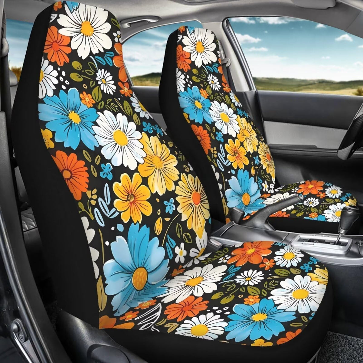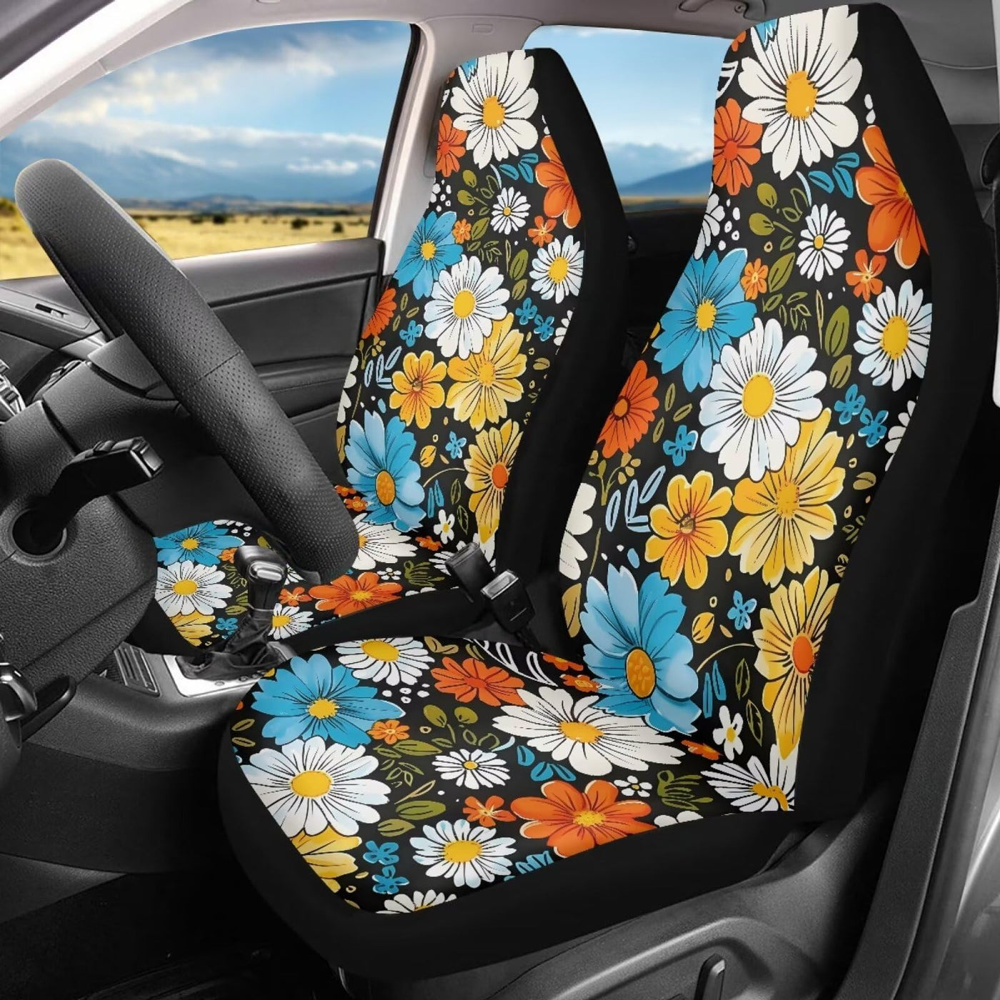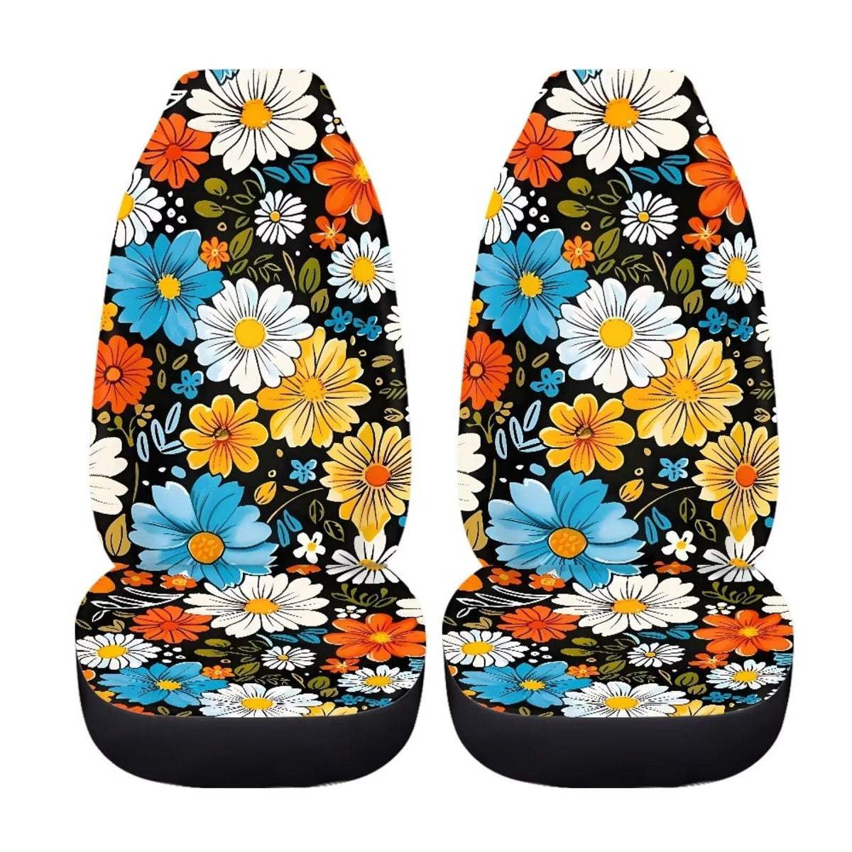 Bigcarjob Hippie Daisy Car Seat Cover Set For Front Seat Only,2 Pack Blossom Flower Printed Auto Front Seat Protector Saddle Bla