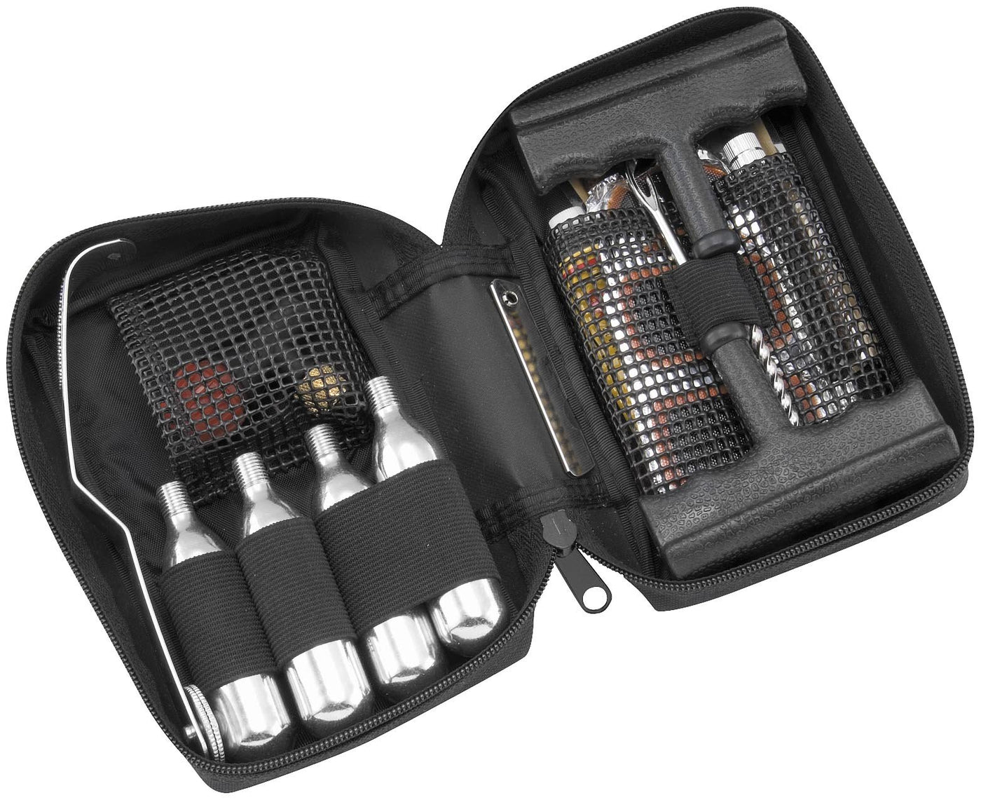 Q: What does the BikeMaster Tire and Tube Flat Repair Kit include?A: This comprehensive flat repair kit includes patches, plugs, a plug insertion tool, hole cleaner, glue, a pressure wheel with a surface preparation tool, and a knife for plug trimming. Additionally, it comes with 4 CO2 compressed air cylinders and an air valve for direct connection to the tire valve.