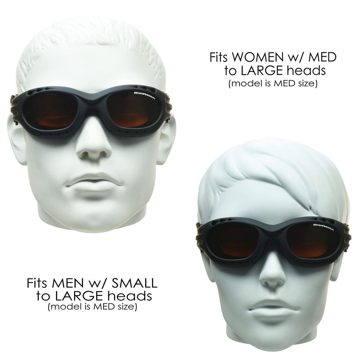 Built for SpeedThe Socket biker goggles are one of our most popular motorcycle goggles for men and women. Equipped with think, soft and dual layer foam cushions, they are not only comfortable but they can seal out wind, dust and debris completely. The Socket goggle is also excellent if you have problems with your eyelashes touching lenses. In addition, these lenses are impact resistant POLYCARBONATE, NOT acrylic, and provide 100% UV protection. Fits all head sizes.