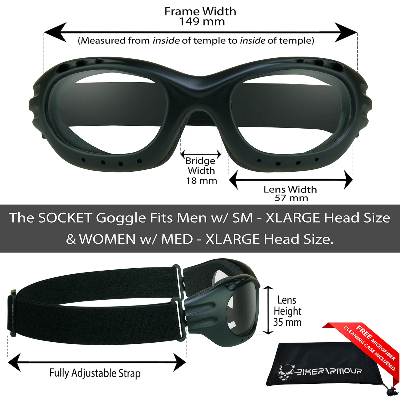 Built for SpeedThe Socket biker goggles are one of our most popular motorcycle goggles for men and women. Equipped with think, soft and dual layer foam cushions, they are not only comfortable but they can seal out wind, dust and debris completely. The Socket goggle is also excellent if you have problems with your eyelashes touching lenses. In addition, these lenses are impact resistant POLYCARBONATE, NOT acrylic, and provide 100% UV protection. Fits all head sizes.