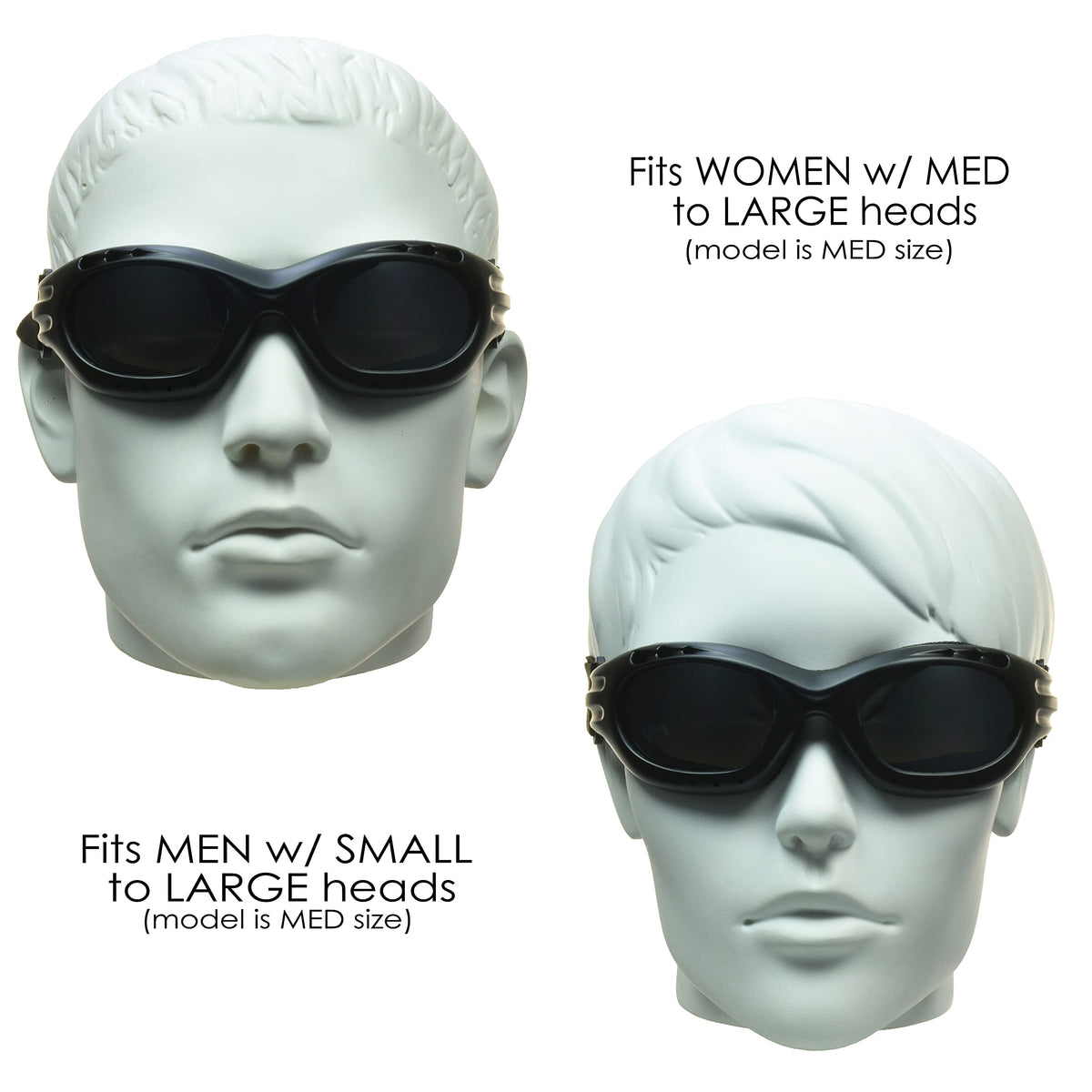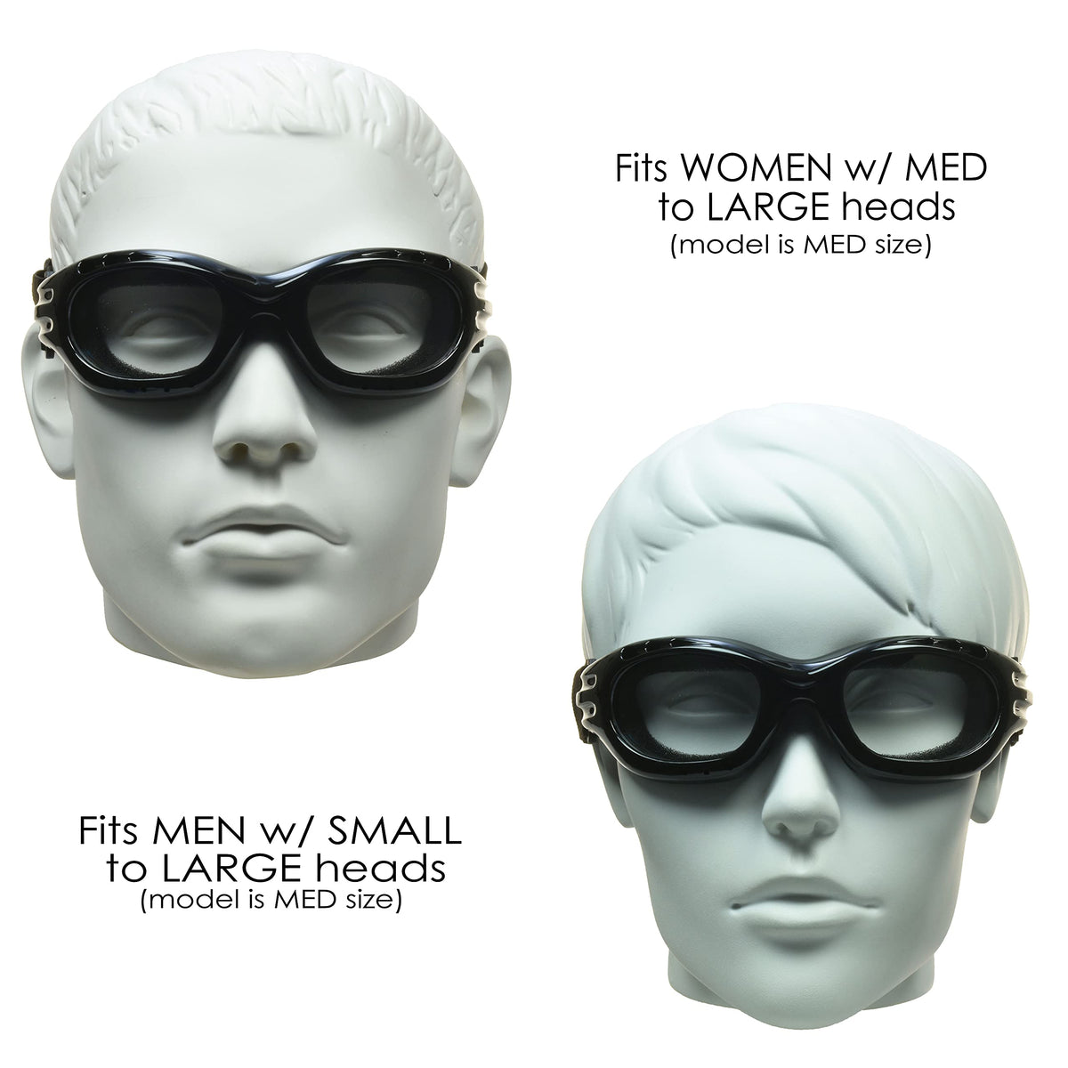 Built for SpeedThe Socket biker goggles are one of our most popular motorcycle goggles for men and women. Equipped with think, soft and dual layer foam cushions, they are not only comfortable but they can seal out wind, dust and debris completely. The Socket goggle is also excellent if you have problems with your eyelashes touching lenses. In addition, these lenses are impact resistant POLYCARBONATE, NOT acrylic, and provide 100% UV protection. Fits all head sizes.