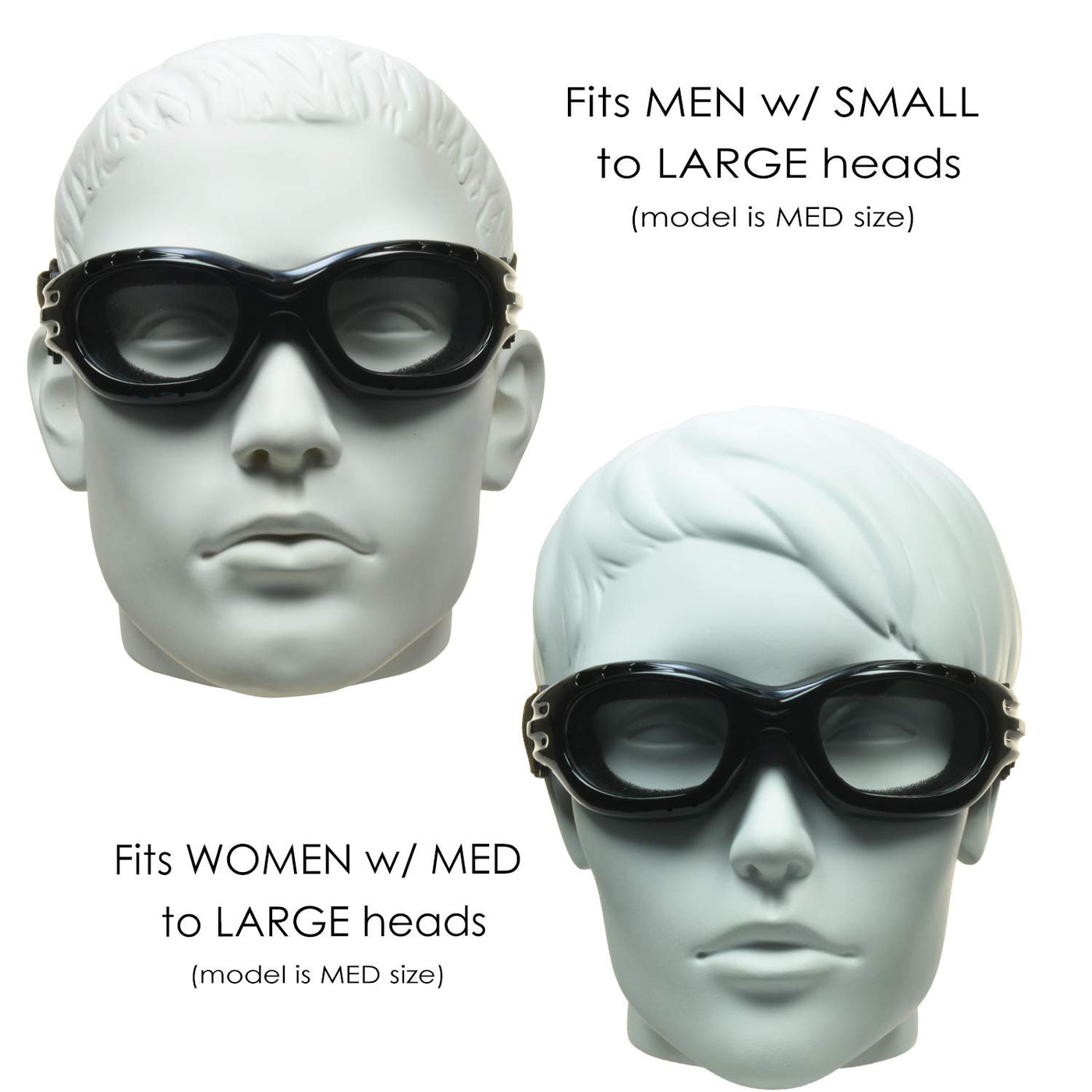 Built for SpeedThe Socket biker goggles are one of our most popular motorcycle goggles for men and women. Equipped with think, soft and dual layer foam cushions, they are not only comfortable but they can seal out wind, dust and debris completely. The Socket goggle is also excellent if you have problems with your eyelashes touching lenses. In addition, these lenses are impact resistant POLYCARBONATE, NOT acrylic, and provide 100% UV protection. Fits all head sizes.