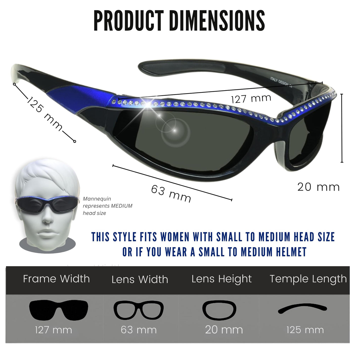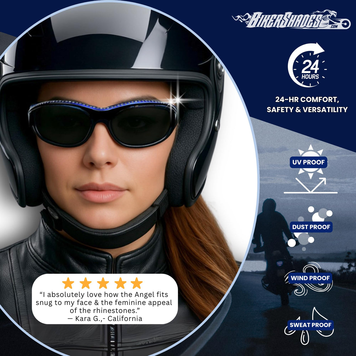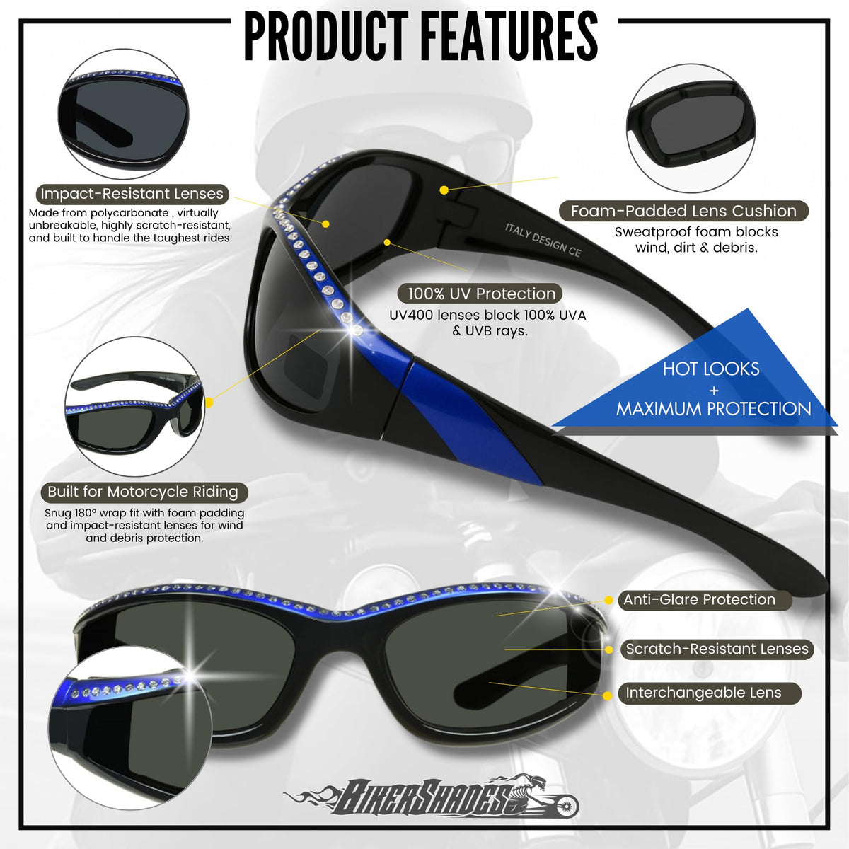 One of the most popular Motorcycle Safety Riding Glasses for Women - Angel is now available with cute and trendy rhinestones frames! Angel Motorcycle sunglasses provide aggressive styling with a sick, bold stripe across the top of the frame color of black, red, purple, pink or blue. Frames are equipped with a soft SWEAT PROOF foam cushion in the frame to seal out wind, dust and debris while you are riding. Lenses are impact resistant POLYCARBONATE, NOT acrylic, and provide 100% UV protection.