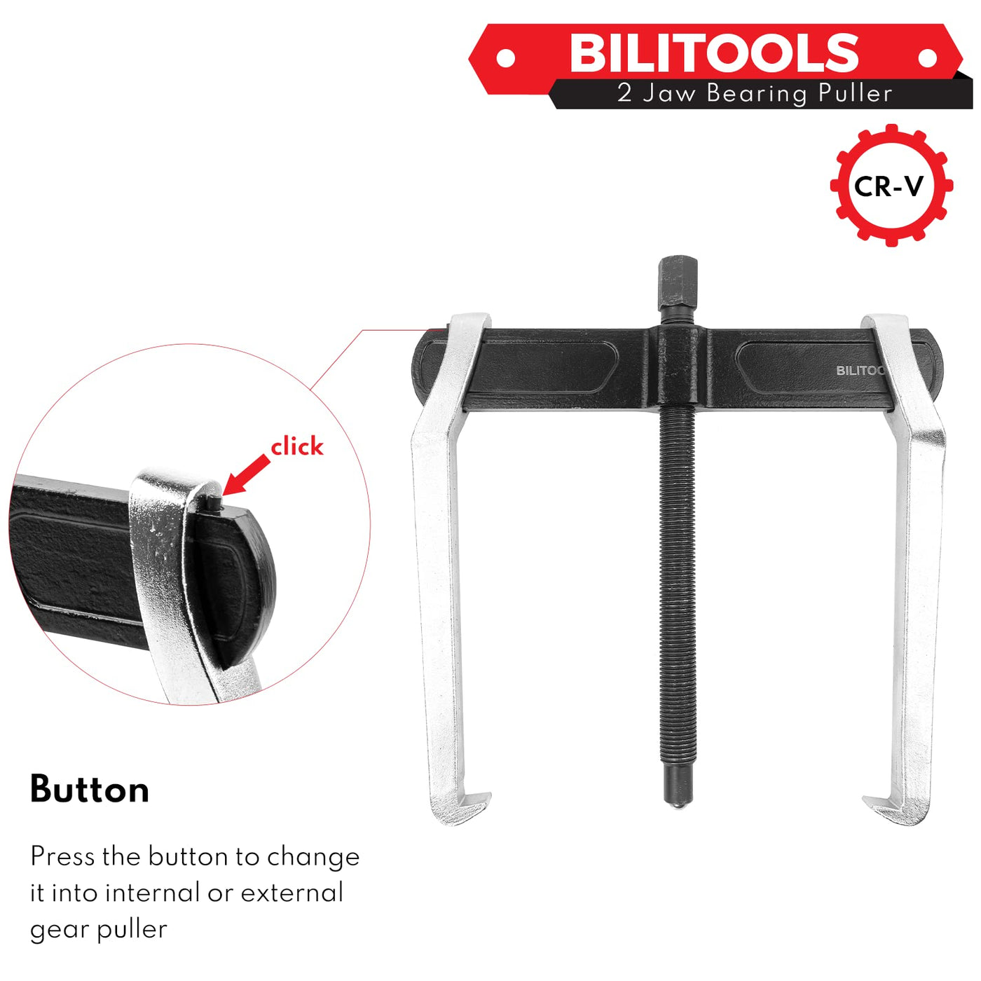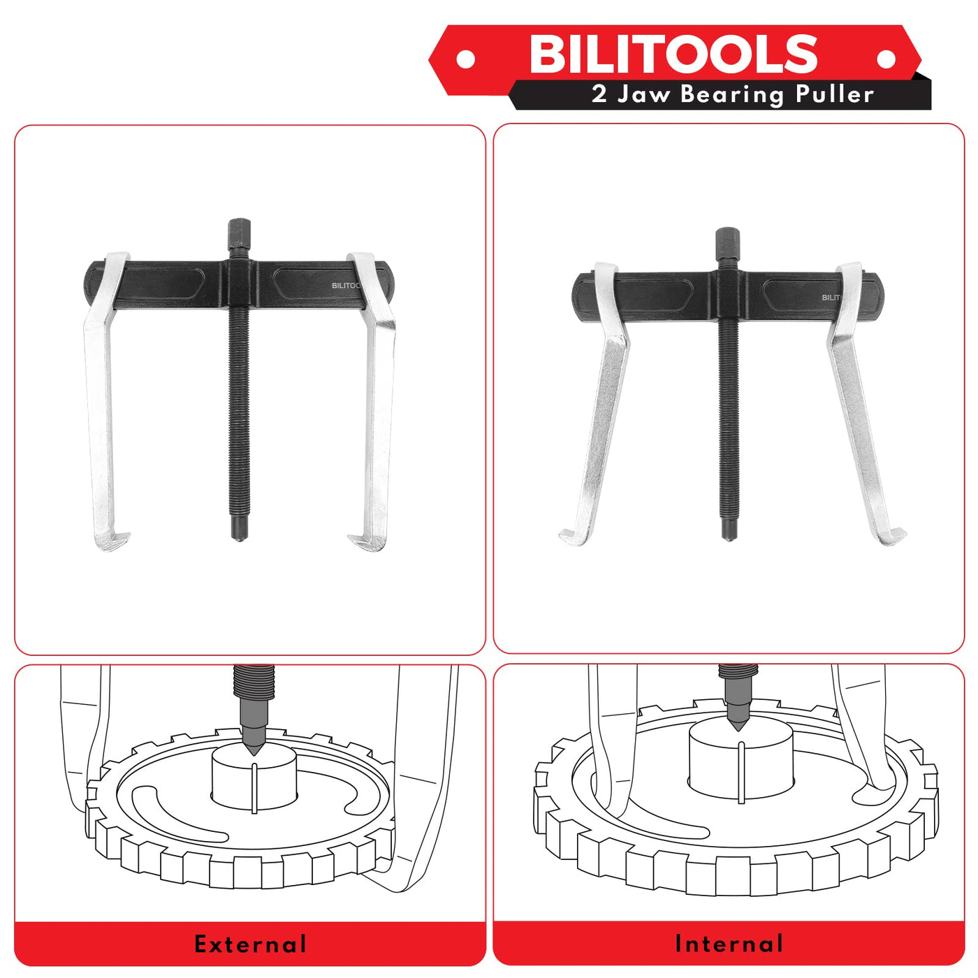 Q: Can this gear puller be used for both internal and external applications?A: Yes, the BILITOOLS 2-Jaw Gear Puller can be easily reversed to pull parts from either the inside or outside, providing versatility for various applications.
