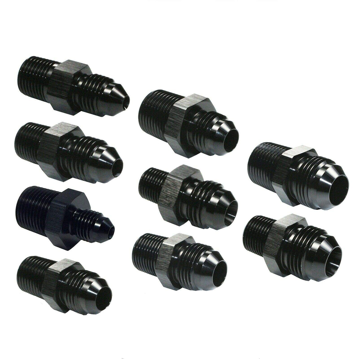 Q: What sizes are available for the BLACKHORSE-RACING hose fitting adapters?A: Sizes available include 3 AN to 1/8 NPT, 4 AN to 1/8 NPT, 4 AN to 3/8 NPT, 6 AN to 1/4 NPT, 6 AN to 3/8 NPT, 6 AN to 1/8 NPT, 8 AN to 3/8 NPT, 10 AN to 1/2 NPT, and 10 AN to 3/8 NPT.