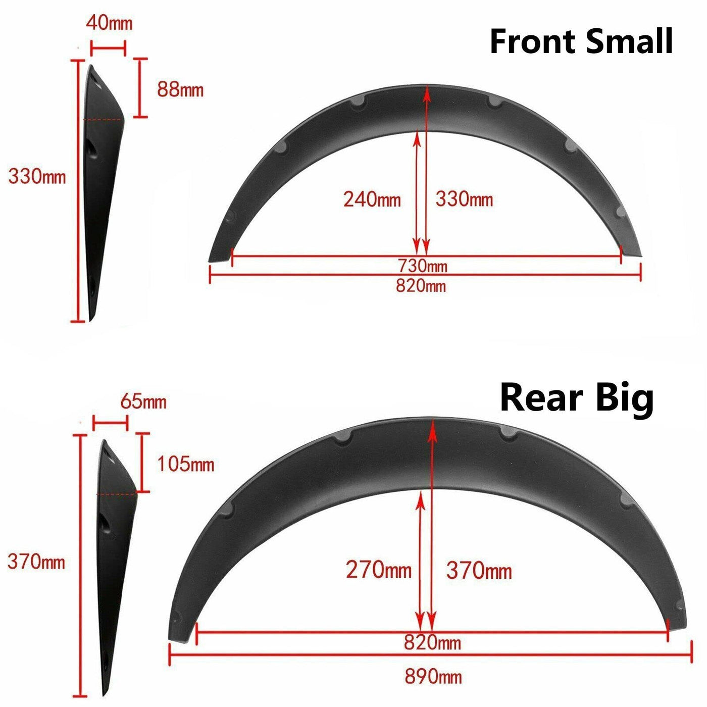 ? Front: 2 Pcs 820mm x 330mm.Rear:2 Pcs 890mm x 370mm .Please make sure to measure vehicle's fenders before purchase! | ?Material:Made of high quality plastic, high strength, resistant to corrosion, harder and more durable. Protect wheel from mud, scratches, sand and other outer damage | ? Stylish: Redefine the look of your car and make your car unique.If you need to wheel flares change color, we strongly recommend you to seek professional spraying factory to change color coating | ? Made of high quality plastic, resistant to corrosion, harder and more durable. | ? Note:If you find that the size of the product may not match after receiving the goods, don't worry at this time! Changing the wheel flares angle can adapt to the wheel brow of most models. Please contact us in time if there is any problem or product defect.