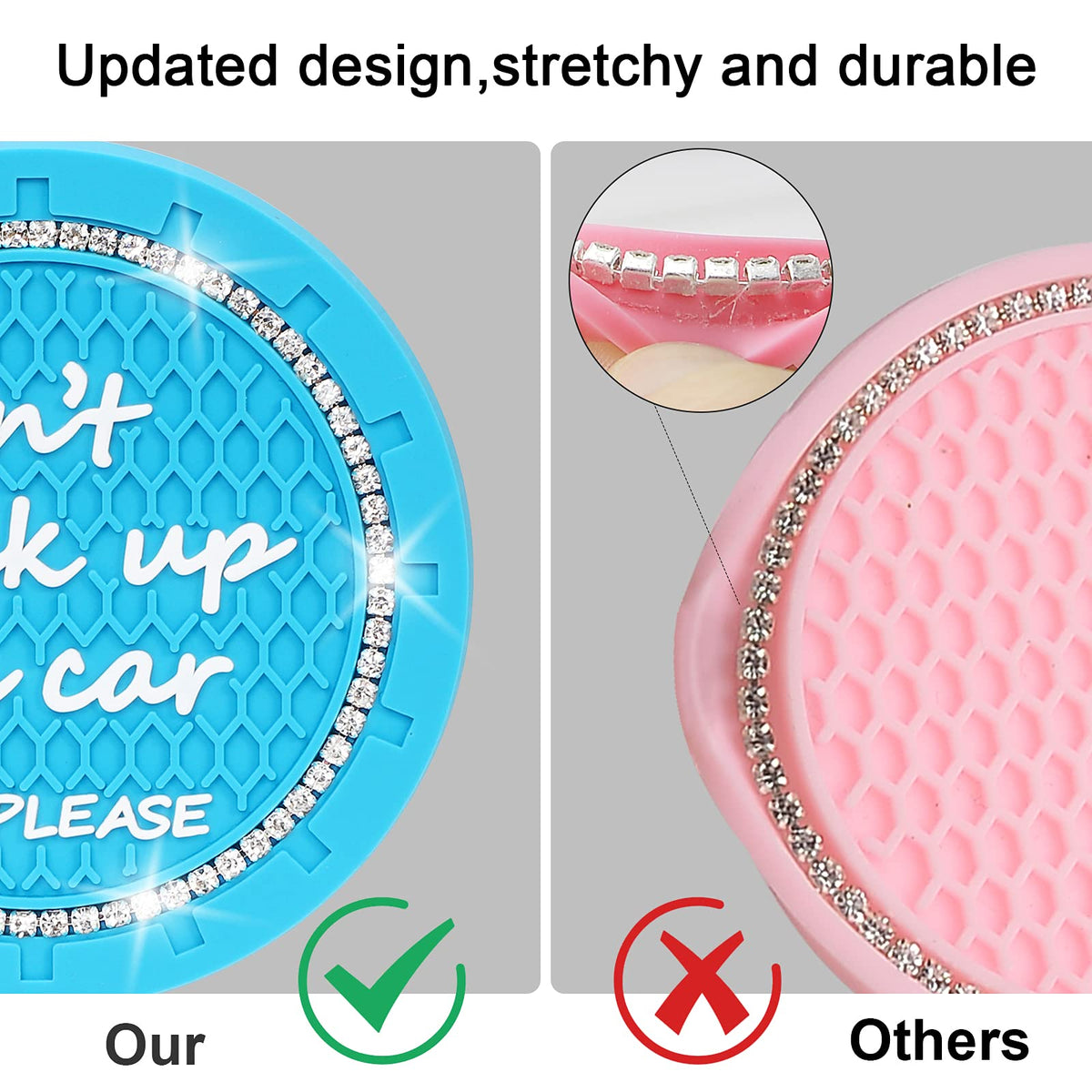 Q: What materials are the car coasters made of?A: The car coasters are made from high-quality, environmentally-friendly silicone and adorned with bling crystal rhinestones for a stylish look.