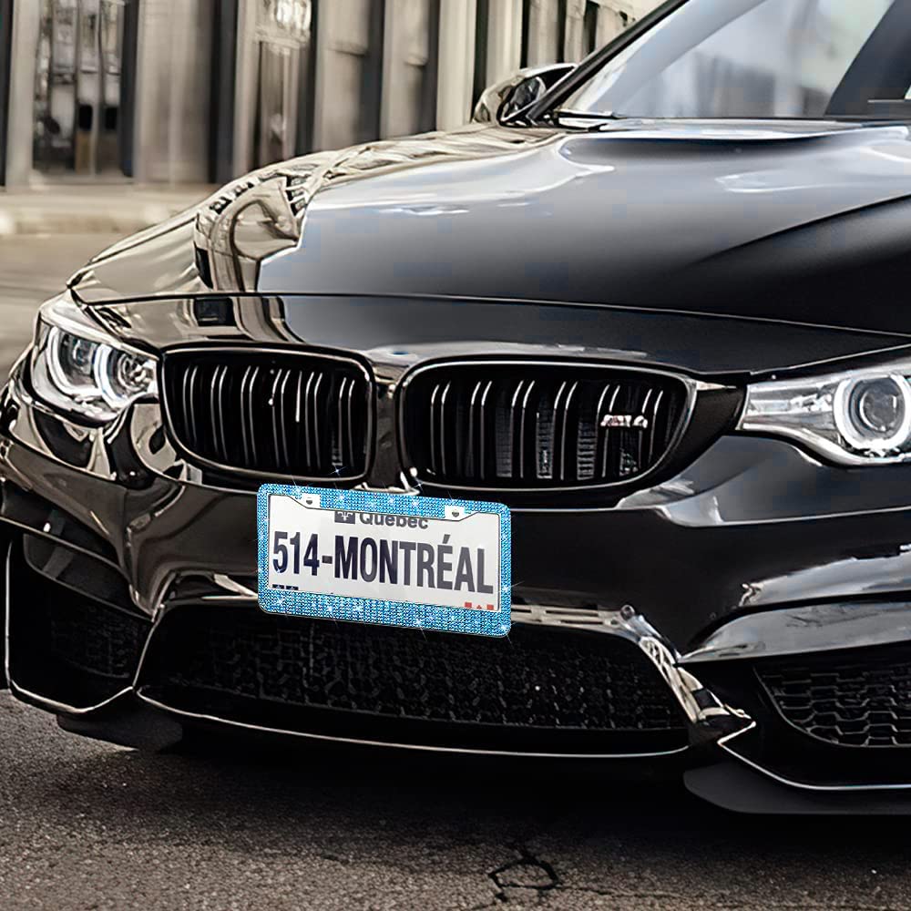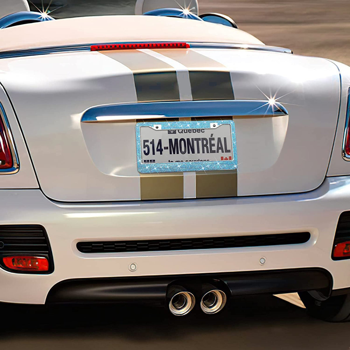 Q: How is the bling effect achieved on this license plate frame?A: The sparkling effect comes from over 1200 pieces of finest 14 facets clear glass diamond rhinestone crystals that are hand-glued onto the stainless steel frame, ensuring durability and a high-quality finish.