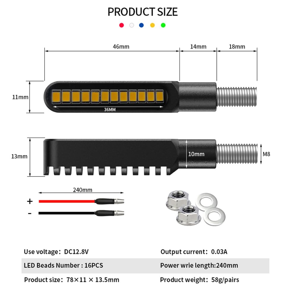 Comes With 2 Pcs Ip68 Waterproof Turn Signal Lights, Suitable For Motorcycle Motorbike Scooter Off Road. | Wire Connection:Black Wire--Negative,Red Wire--Turn Signal(Sequantial)Yellow.It Will Maybe Need Flash Relay Fix The Problem If Stock Lamp Is Halogen - Situation Like This (Turn Signals Activate But Only Go To Half Way On Led) | Built-In 16Leds,Bright Visualization In Daytime. | Metal Shell Color: Black Led Color:Amber Color | Amber Color And Flowing Mode, Cool Design, Waterproof And Perfit Fit For Turn Signal And Indicators Usage. Improve Driving Safety Performance.