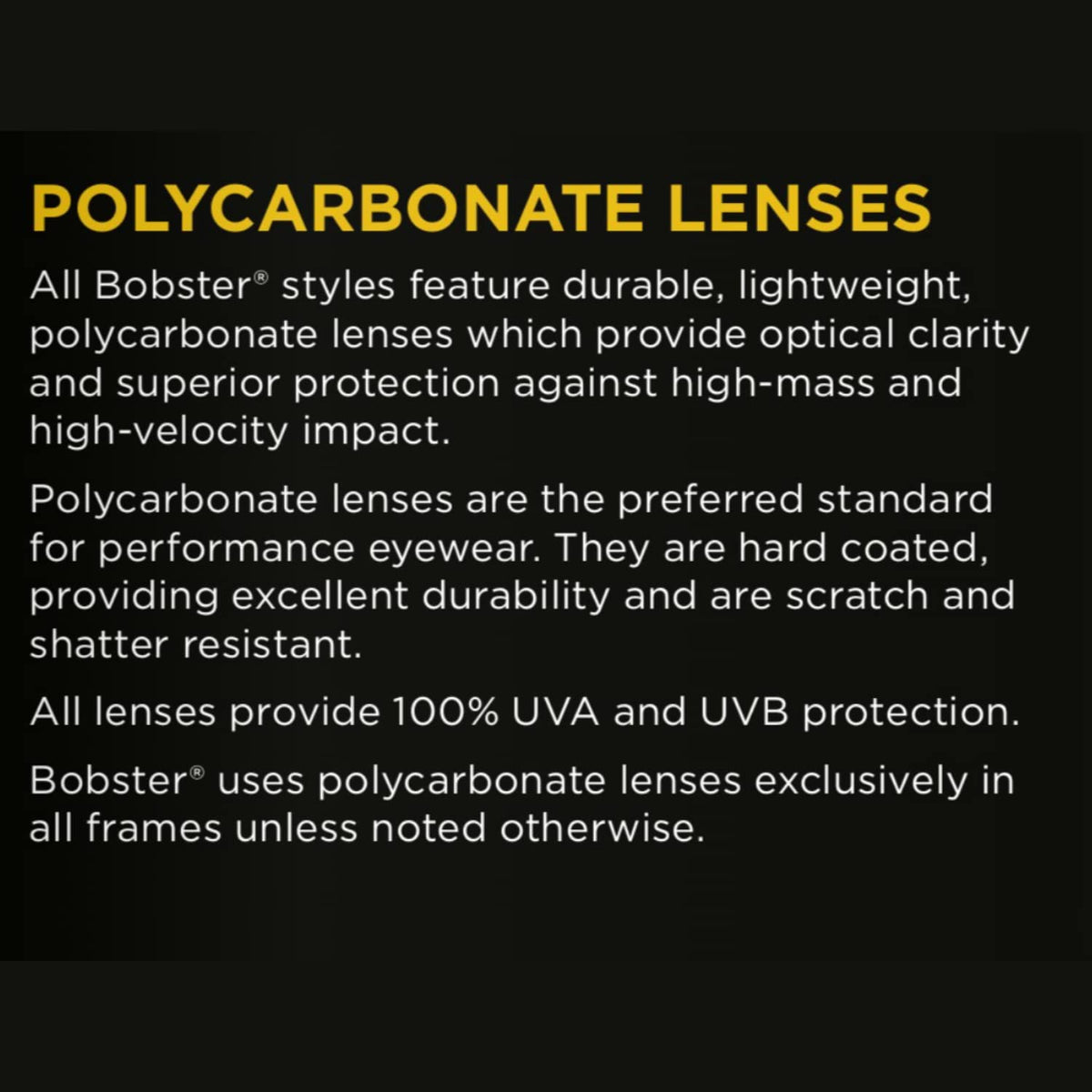 From The Manufacturerbobster Eyewear Specializes In The Design And Manufacturing Of Performance Eyewear Suitable For Normal To Extreme Activities. Launching Its First Eyewear Line In 1996, Bobster Eyewear Has Become A Well-Known Trade Name Amongst Its Target Market And Is A Brand That Has International Recognition. Bobster Eyewear Offers Eyewear That Is Easily Customizable To Suit Constantly Changing Environmental Conditions And User Requirements.
