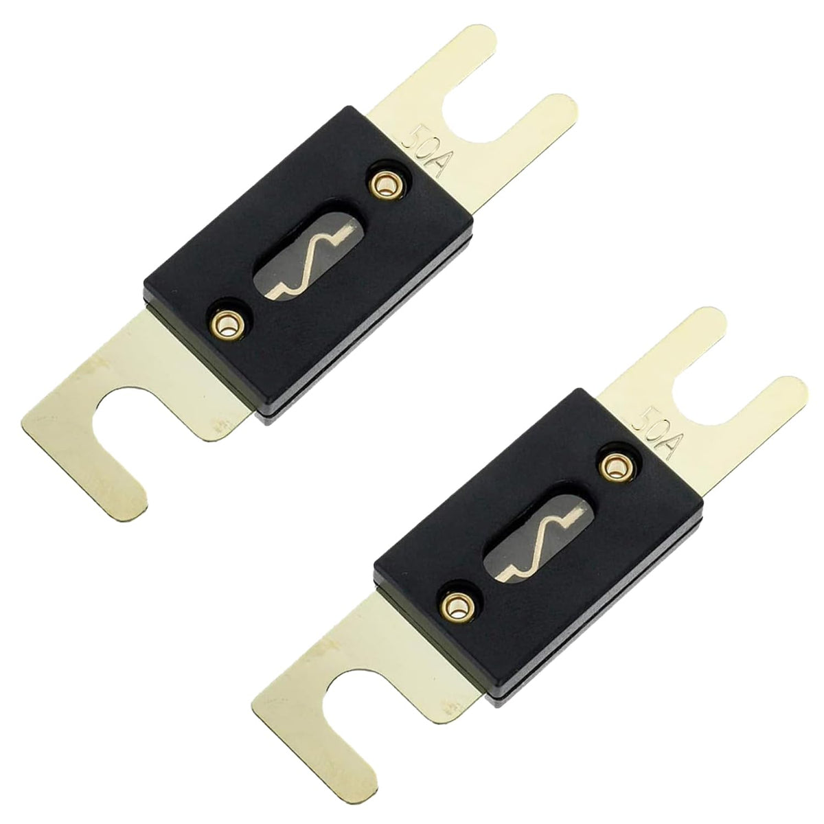 BOJACK 2 Pcs ANL Fuse Holder with 2 Pcs 50Amp Fuses High-quality products, strong conductivity, waterproof and dustproof, durable and reliable. Fuse Size: 80x22.5x9 mm/ 3.15x0.9x0.35 inch (L*W*T); Fuse Holder Size: 123 x 37 x 40mm / 4.8 x 1.5 x 1.6 inch (L*W*H). Rated voltage: 32VDC Reach 100% of rated voltage and melt in 4 hours at the fastest. Reaching 200% of the rated voltage, melting is the slowest 10 seconds. It reaches 350% of the rated voltage and melts in 0.5 seconds at the slowest. Material: copper alloy, gold plating and PVC material Gold plating metal sheet construction with a clear protective non-conductive resistant cover Package Content: 2 * ANL fuse holder 2 * 50A ANL fuse