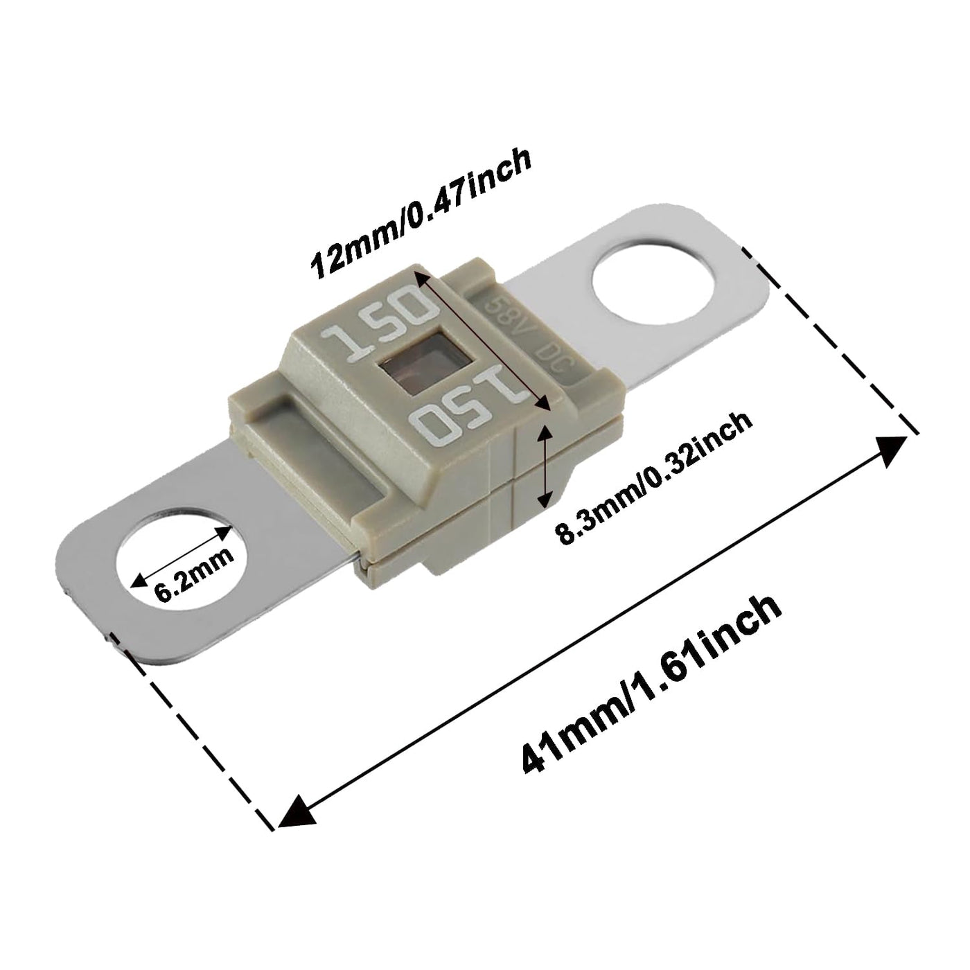 BOJACK 2 Pcs ANS Car Fuse Holders and 2 Pcs High Current Bolt-on 150A Amp Midi Fuses ANS Fuse holder Fuse Type: mini size ANS fuse Size: 51.7 27.5 25 mm (L*W*H), two holes spacing 30 mm Structure: ANS fuse holder is made up of M5 threaded bolts and hex nuts Midi Fuse Model: 150A Color Code: light green Maximum Current: 150A Nominal Voltage max: 32 V/DC Length: approx 41 mm Width: approx 10 mm Hole Diameter: approx 5.5 mm Hole Spacing: approx 30 mm Casing Material: polyamide Material: copper Surface: galvanised Performance: ISO 8820-5 Midi high current fuses are built between battery and unit (e.g. starter, alternator, air conditioner, hydraulic pump)and protect the main user itself or the live cable. Package List: 2 x ANS Fuse Holders 2 x Midi Fuses 150A