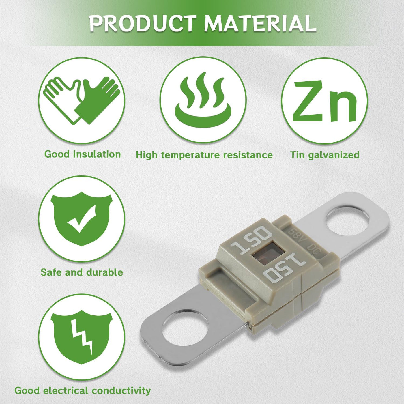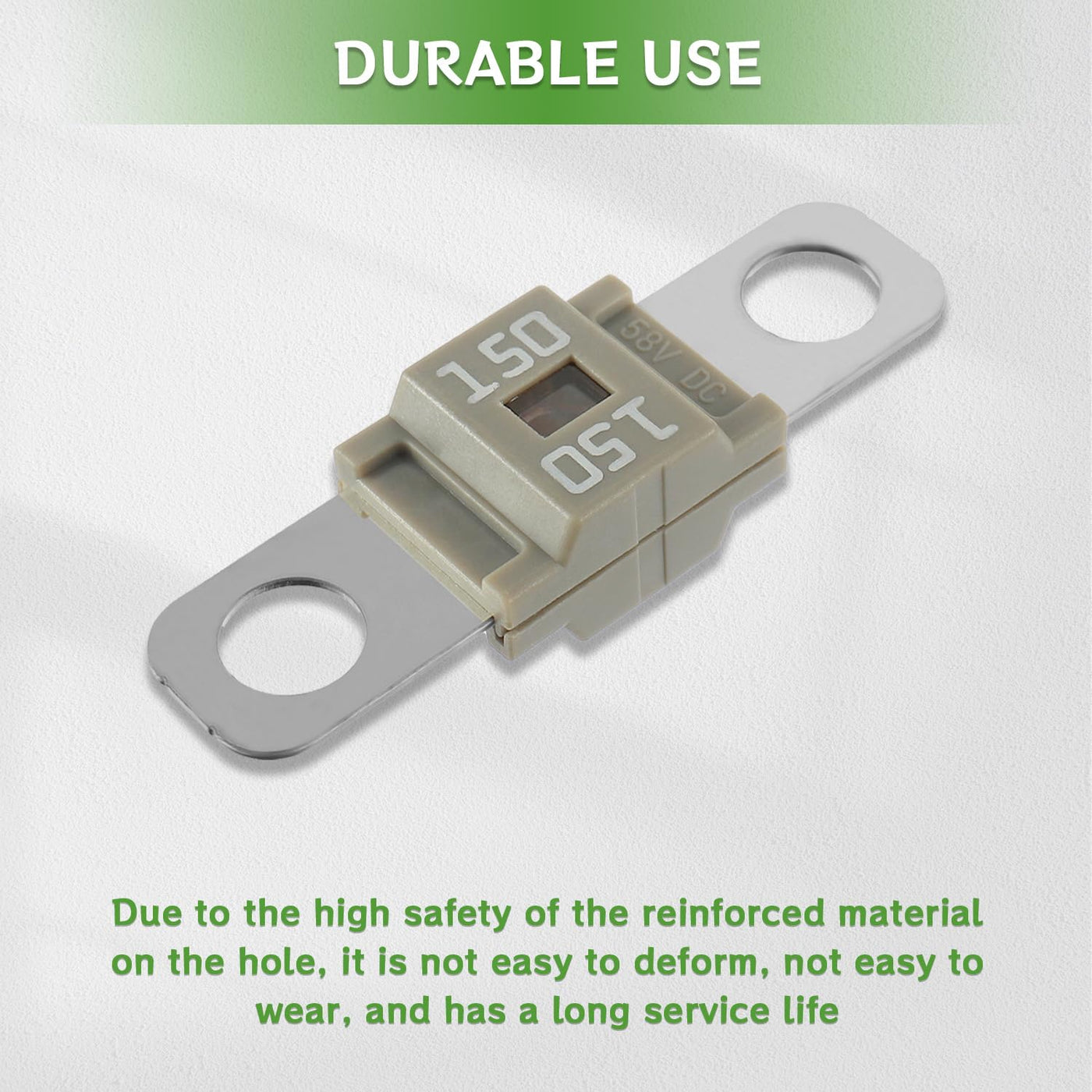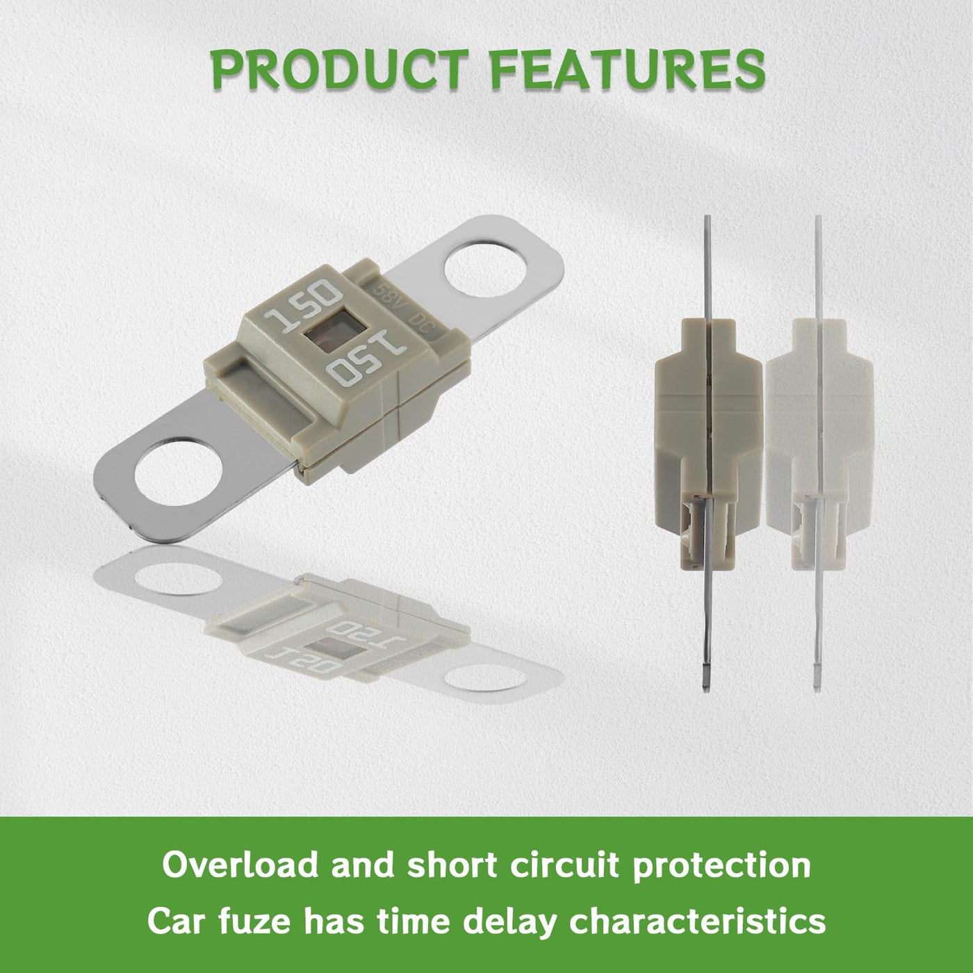 BOJACK car fuses There are six types of this fuse, suitable for most cars. They range from 40 AMP to 150 AMP for all your urgent needs. This car fuse is commonly used in cars, trucks, construction vehicles, agricultural machinery, passenger cars, caravans. Midi high current fuses are built between battery and unit (e.g. starter, alternator, air conditioner, hydraulic pump) and protect the main user itself or the live cable. Specification: Model: 150A Color Code: Green. Maximum Current: 150A. Nominal Voltage max: 32 V/DC. Length: approx 41 mm. Width: approx 10 mm. Hole Diameter: approx 5.5 mm. Hole Spacing: approx 30 mm. Casing Material: polyamide. Material: copper. Surface: galvanised. Performance: ISO 8820-5. Package Include: 3 x car midi fuses 150A