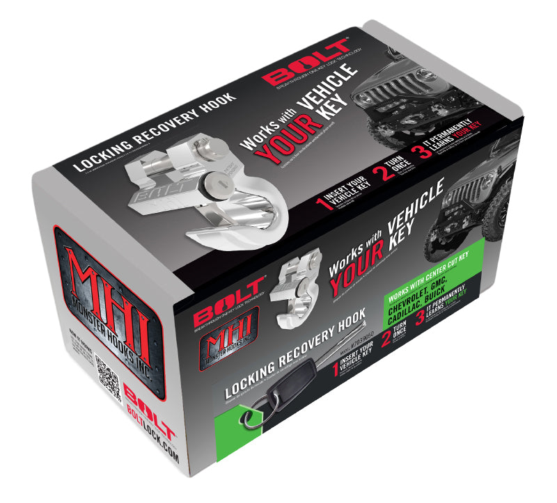 Make A Statement With This Awesome New Locking Tow Hook From Bolt Lock And Monster Hooks. Made Or Aircraft Grade Aluminum, This Hook Is Rated At 10,000 Pounds. Hook Fits Standard 7/8' Bumper Tabs And Will Swivel 160 Degrees To Provide Same And Secure Recoveries. Stainless Steel Lock Shutter Keeps Dirt And Moisture Out. Featuring Patented Bolt Breakthrough One-Key Lock Technology, The Bolt Locking Tow Hook Locks And Unlocks With Your Vehicle Ignition Key. Please Verify Fitment By Looking Up The Year, Make And Model Of Your Vehicle.