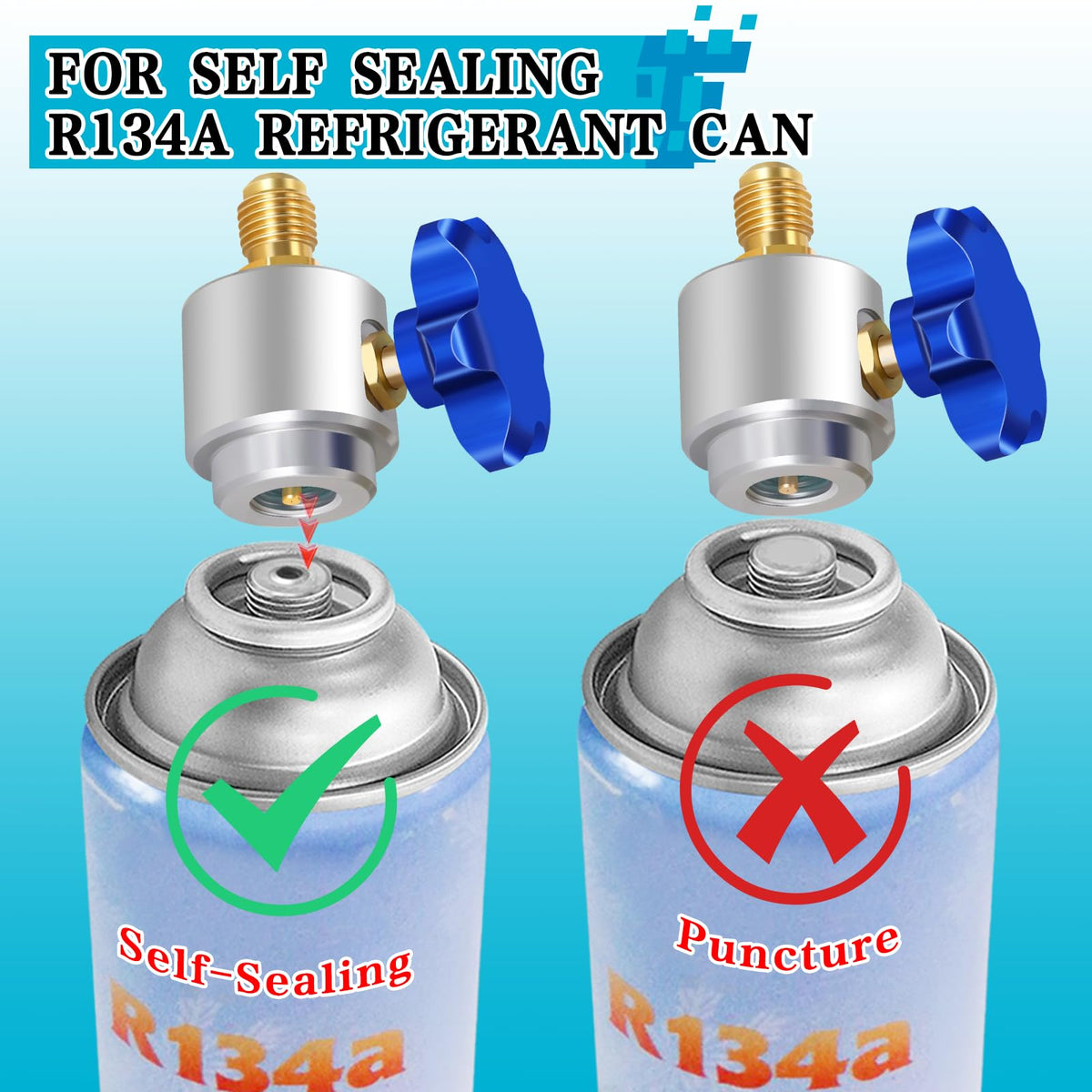 Q: How does the self-sealing feature of the R134A Can Tap work?A: The self-sealing feature allows the can tap to open R134a cans easily and securely seal them off after use. This design helps prevent waste of refrigerant and ensures it can be reserved for future use.