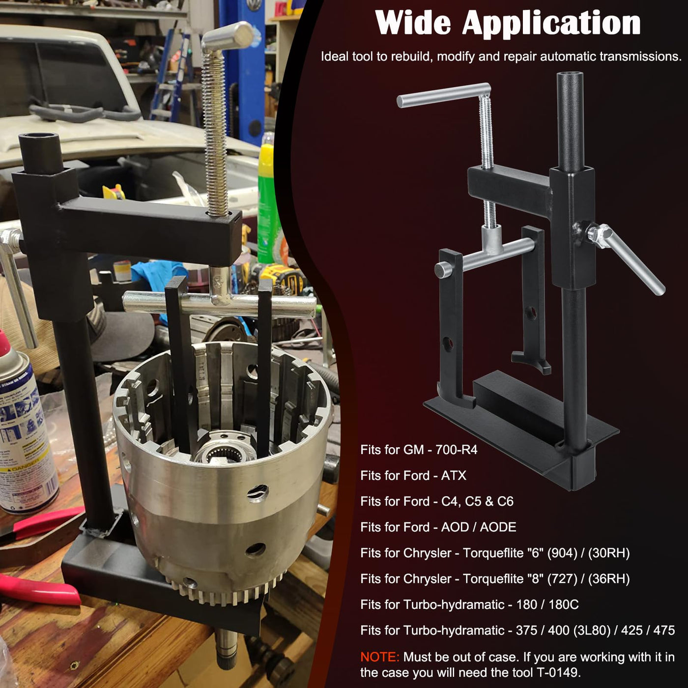 Q: What types of transmissions is the Bonbo T-0158 Universal Clutch Drum Spring Compressor compatible with?A: The Bonbo T-0158 is compatible with various transmissions including Turbo-hydramatic 180/180C, 375/400 (3L80), 425, 475, Ford C4, C5, C6, AOD, AODE, ATX, Chrysler Torqueflite '6' (904) and '8' (727), and GM 700-R4.