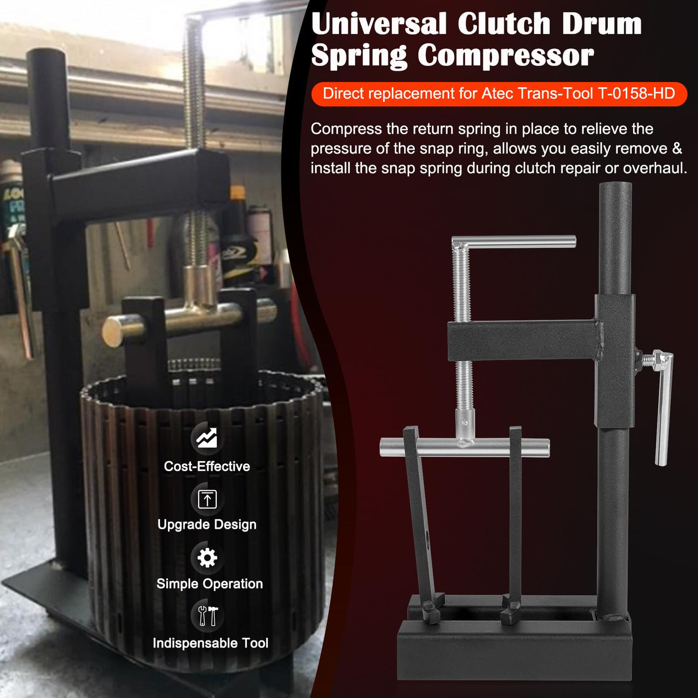 Adjustable to fit most Clutch Drums. Long legs for deep drums. Mounts on work bench or vise. Economical unit. Universal clutch drum spring compressor. Adjustable, for most models of cars and light trucks. Applies pressure to the retaining washer in the clutch drum to compress clutch piston return springs, in order to remove or install snap ring during clutch repair or overhaul. Features: Adjustable to fit most Clutch Drums. Long legs for deep drums. Mounts on work bench or vise. Economical unit. Note: Does not do rear case pistons. Compatible with Atec Trans-Tool T-0158-HD
