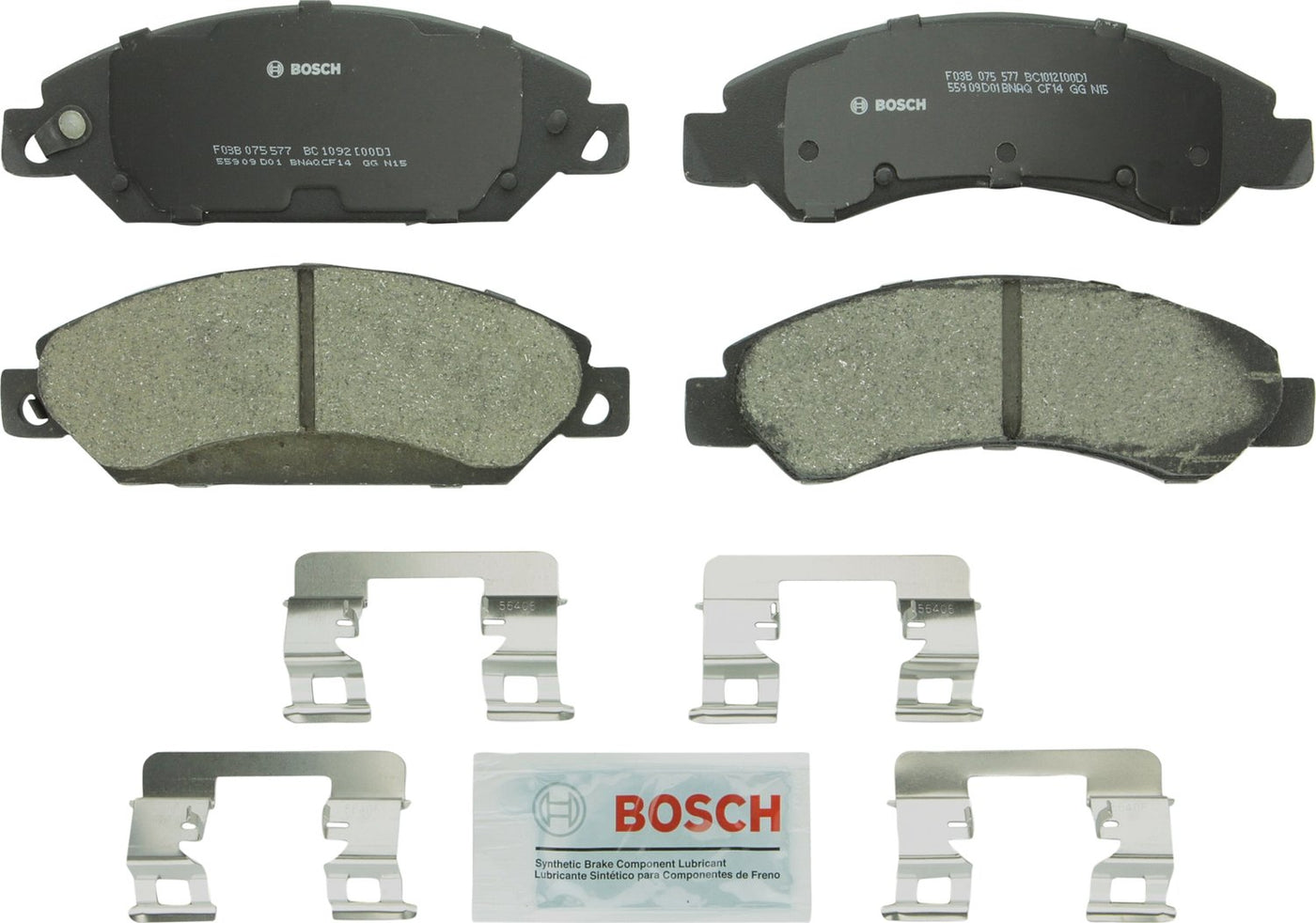 Q: How do I install the BOSCH BC1092 brake pads?A: Installing the BOSCH BC1092 brake pads typically involves removing the wheel, caliper, and old pads, then placing the new ceramic brake pads into the caliper bracket. Ensure to apply the included synthetic lubricant to sliding contact points to reduce resistance. Always consult your vehicle's service manual for detailed installation instructions or consider professional installation if unsure.