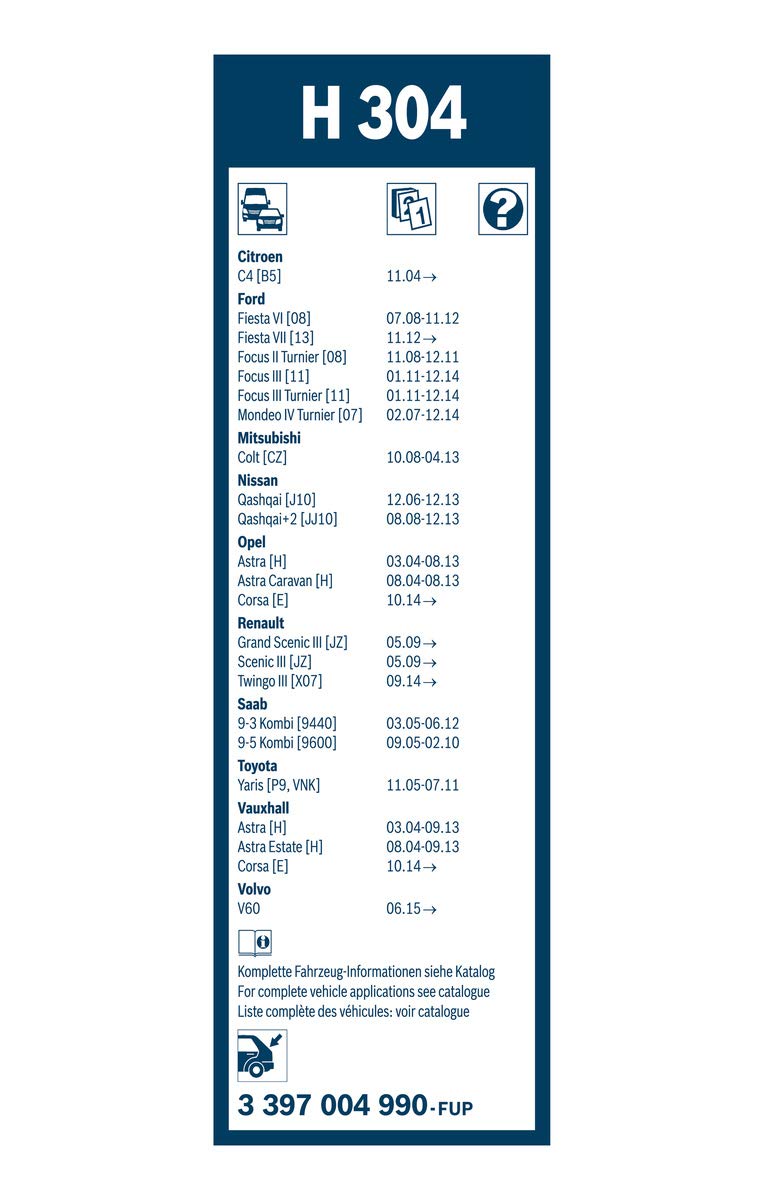 Q: What vehicles are compatible with the BOSCH H304 Rear Wiper Blade?A: The BOSCH H304 Rear Wiper Blade is designed to fit a wide range of popular domestic, Asian, and European vehicles, ensuring a reliable and secure fit for specialty rear applications.