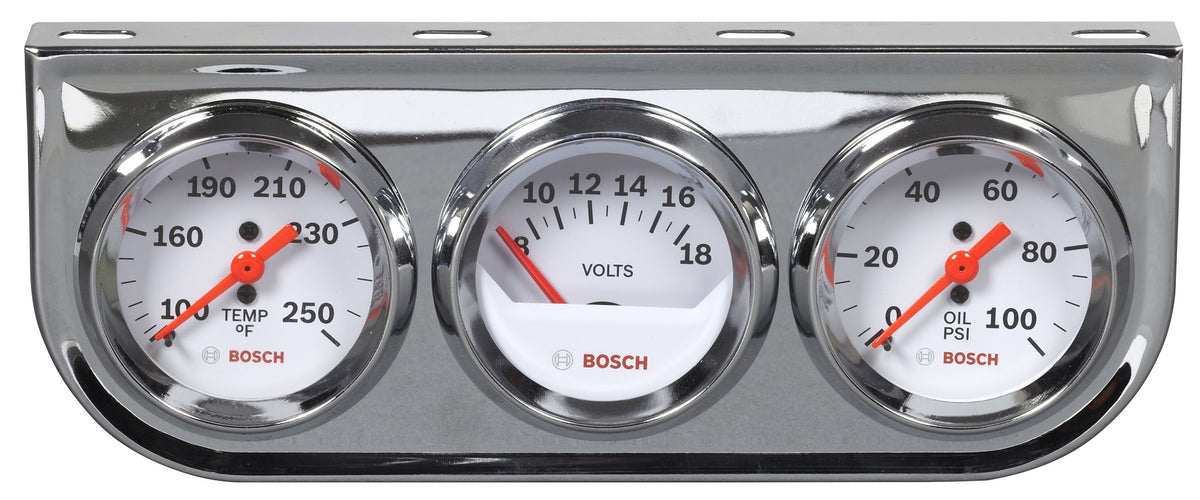 Q: What gauges are included in the Bosch SP0F000046 Triple Gauge Kit?A: The Bosch SP0F000046 Triple Gauge Kit includes three gauges: the Oil/Water Temperature gauge (SP0F000045), the Electrical Voltmeter (SP0F000043), and the Mechanical Oil Pressure gauge (SP0F000044), all designed with a 2" white dial face and chrome bezel.