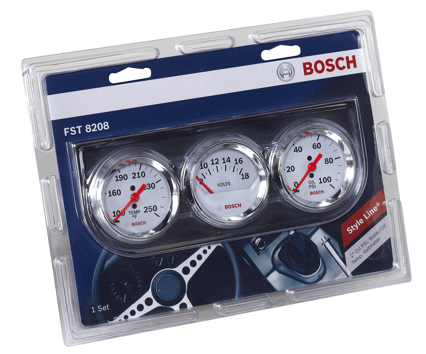 The Bosch Sp0F000046 Is A Style Line 2'' Triple Gauge Kit. It Features Oil/Water Temperature Sp0F000045, Electrical Voltmeter Sp0F000043, And Mechanical Oil Pressure Sp0F000044 Gauges. The Gauges Are 2'' White Dials For A 2-1/16'' Opening And Features Chrome Bezels With A Removable Chrome Mounting Panel. Includes 72'' High Temperature Nylon Tubing With 1/8'' And 1/4'' Npt Thread Fittings. Also Includes Mounting Hardware And 12 Volt Internal Lighting. Only For 12 Volt Negative Ground Systems. The Style Line Features A Clean Easy To Read Look With A Bright Pointer Against A White Or Black Background. Bosch Is Known For Precision, Engineering, And Innovation. Add Style And You Have The First-Ever Line Of Bosch Gauges, Including Replacement Tachometers, Speedometers, Temperature And Pressure Gauges For All Applications. Bosch Branded Gauges Represent The Latest In Design Following Our 100+ Year History Of Automotive, Industrial, And Racing Products.