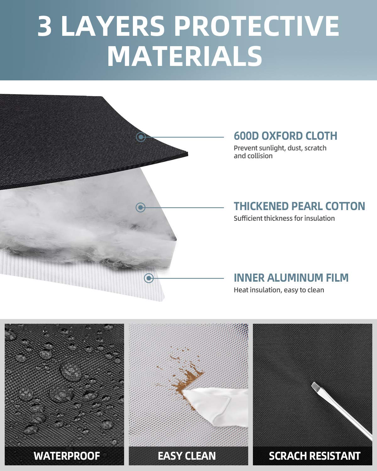 Q: What materials are used in the construction of the BougeRV refrigerator cover?A: The cover is made from durable and weatherproof 600D Oxford cloth, thickened pearl cotton for insulation, and an inner aluminum film for heat insulation. These materials work together to protect your refrigerator from scratches, bumps, and environmental elements.