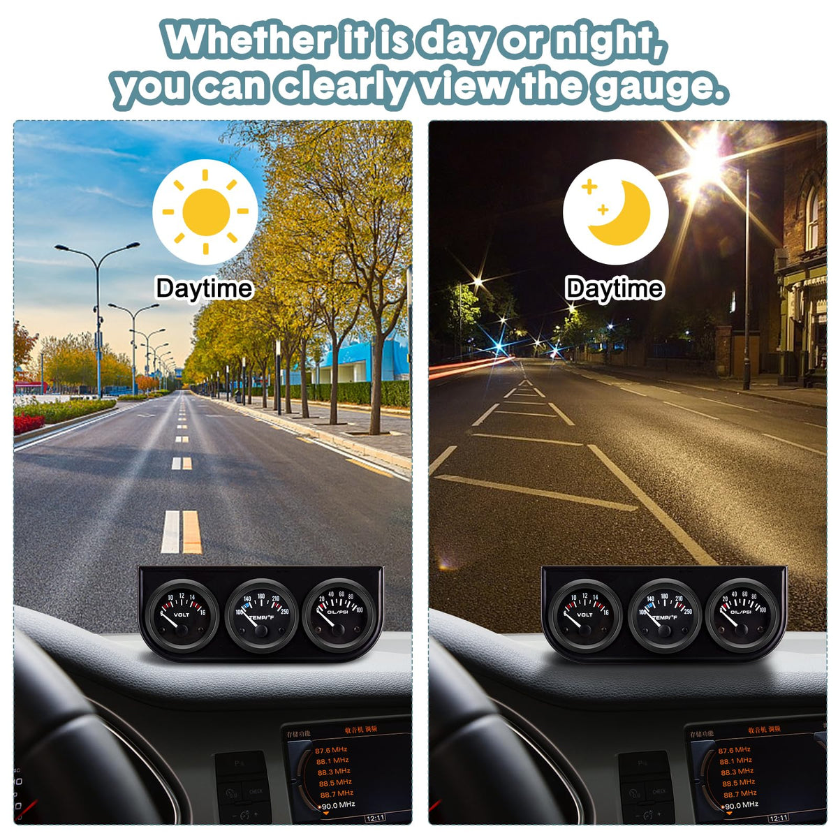 Q: What are the features of the BREADEEP 52mm 3 in 1 Car Auto Gauge Kit?A: The BREADEEP 52mm 3 in 1 Car Auto Gauge Kit includes three essential gauges: an oil pressure gauge, a water temperature gauge, and a volt meter. It features a durable black dial shell made of ABS and stainless steel, ensuring longevity and resistance to wear. The gauges are illuminated for easy reading in low light conditions, and they offer improved accuracy compared to indicator lights.