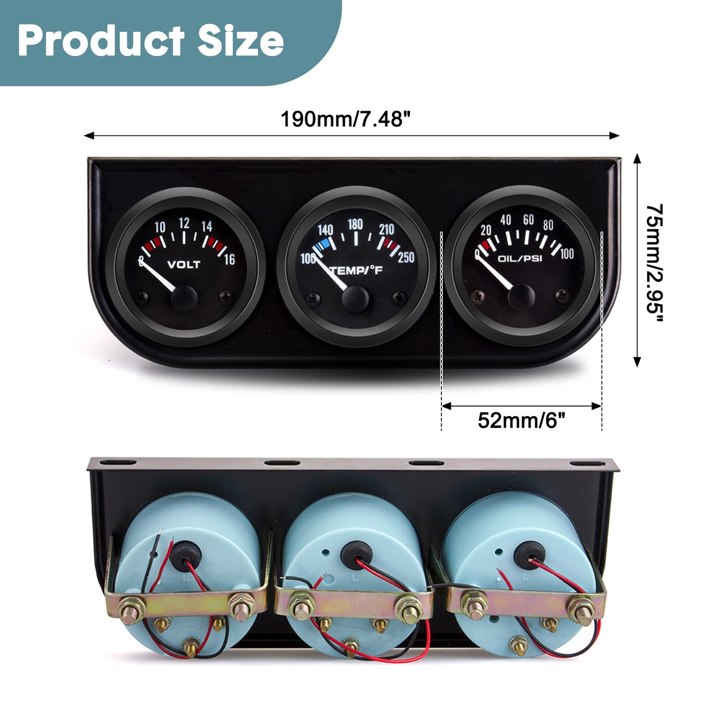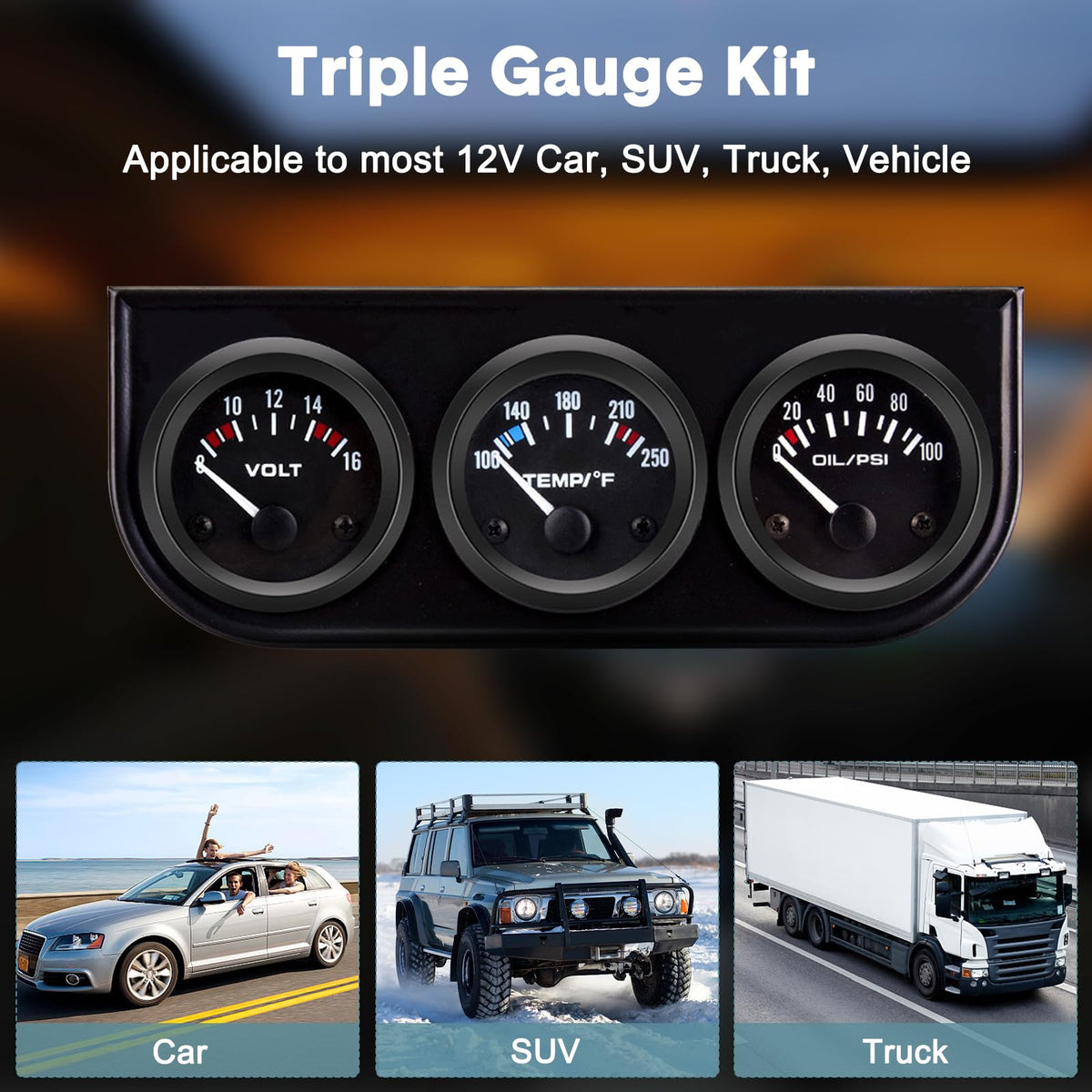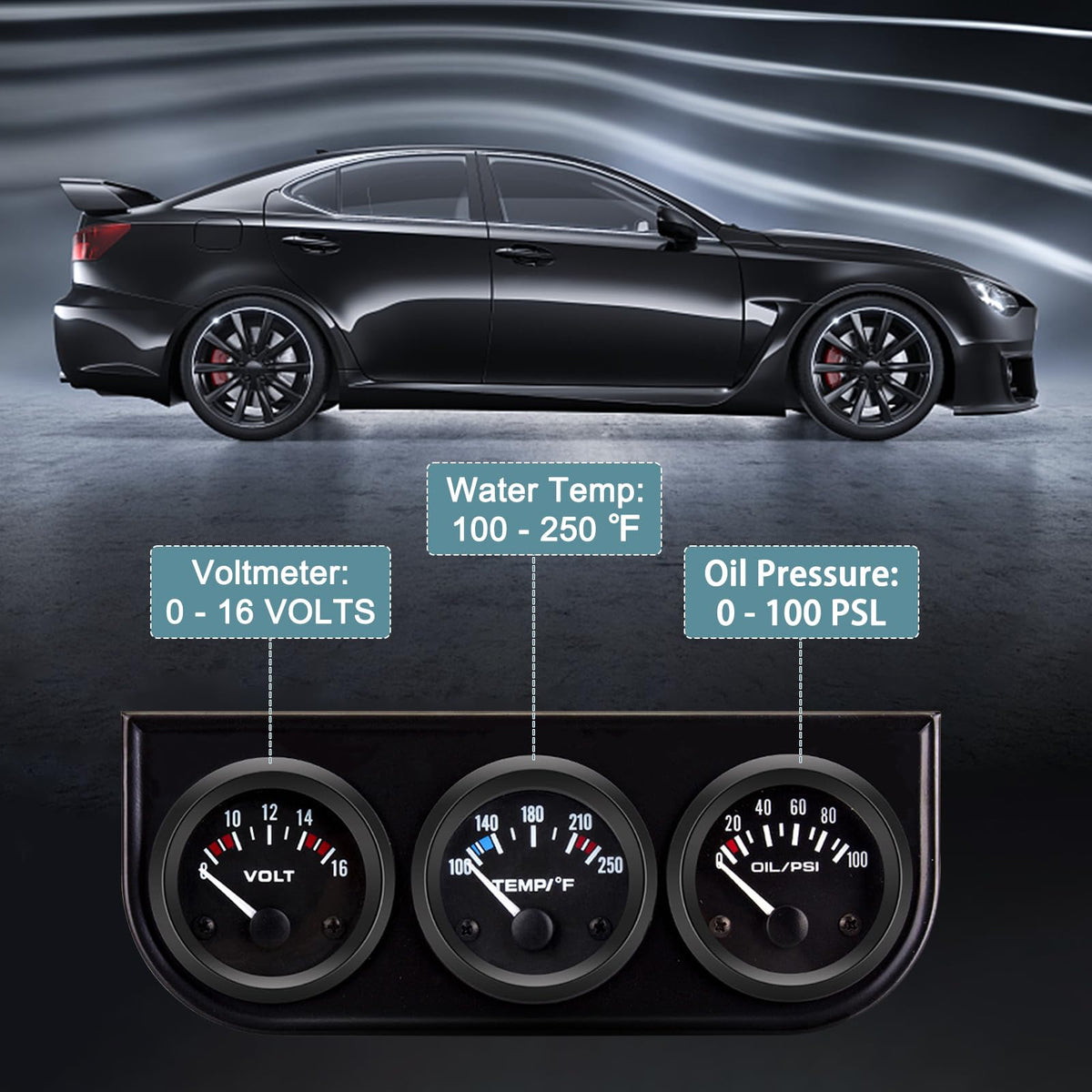 Q: What are the features of the BREADEEP 52mm 3 in 1 Car Auto Gauge Kit?A: The BREADEEP 52mm 3 in 1 Car Auto Gauge Kit includes three essential gauges: an oil pressure gauge, a water temperature gauge, and a volt meter. It features a durable black dial shell made of ABS and stainless steel, ensuring longevity and resistance to wear. The gauges are illuminated for easy reading in low light conditions, and they offer improved accuracy compared to indicator lights.