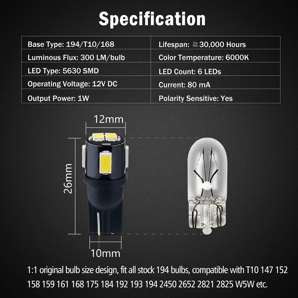 Features: -Easy Installation As A Direct Replacement Bulb -Ultra Bright Led, Unique And More Vivid Color -Will Not Fade Or Turn Yellowish Over Time. -The Leds Will Not Burn Your Stock Wires Nor Melt The Lamp Covers. -High Quality Aluminum Body - Low Temperature, Low Power Consumption, & Long-Lasting Life Up To 30,000 Hours. Specifications: Bulb Type: 194/168/T10 Socket Lumen: 300Lm/Bulb Led Lifetime:30000+Hours Color Temperature: 6000K Dimensions:1.06 (2.6Cm) *0.39 (1Cm) Net Weight: 2.6G/Bulb Led Quantity:6 Leds Led Type:5630 Smd Beam Angle: 360 Degree Output: 2 Watts Operating Voltage: 12V Dc Cross Reference: 194 168 2825 W5W T10 124 158 158Ll 160 161 168A 168Ll 168Na 168St 175 192 193 194A 194Ll 194Na 194Nall 194St 195 2821 2821Ll 2825L 2825Ll 2825St 2827 3652 558 579 658 912Ll 916 916Ll 916Na 917 917Ll 920 921 922 W10W W5Wb Etc. Application: Dome Lights, Map Lights, License Plate Lights, Trunk/Cargo Lights, Door Courtesy Lights, Front/Rear Side Marker Lights, Vanity Mirror Lights, Etc. Notes: Please Check And Confirm Whether These Bulbs Fit Your Car Before Purchasing If It Doesn'T Light Up After Inserting Into The Socket, All You Need To Do Is Insert It Oppositely. When Installing On Some Vehicles With Canbus System, You May Need To Tap On Load Resistors To Get Rid Of The Error Code On Dashboard And/Or Flickering Issue. Brishine Is A Professional Large-Scale Manufacturer Of All Types Of Led Lighting Products And Hid Lighting Products, Integrating Development And Production Together. We Have Many Years Of History In The Auto Light Field. All Our Items Are Covered By 1-Year Warranty And We Offer Friendly 24H Customer Service, Please Feel Free To Contact Us If There Is Any Question Or Request.
