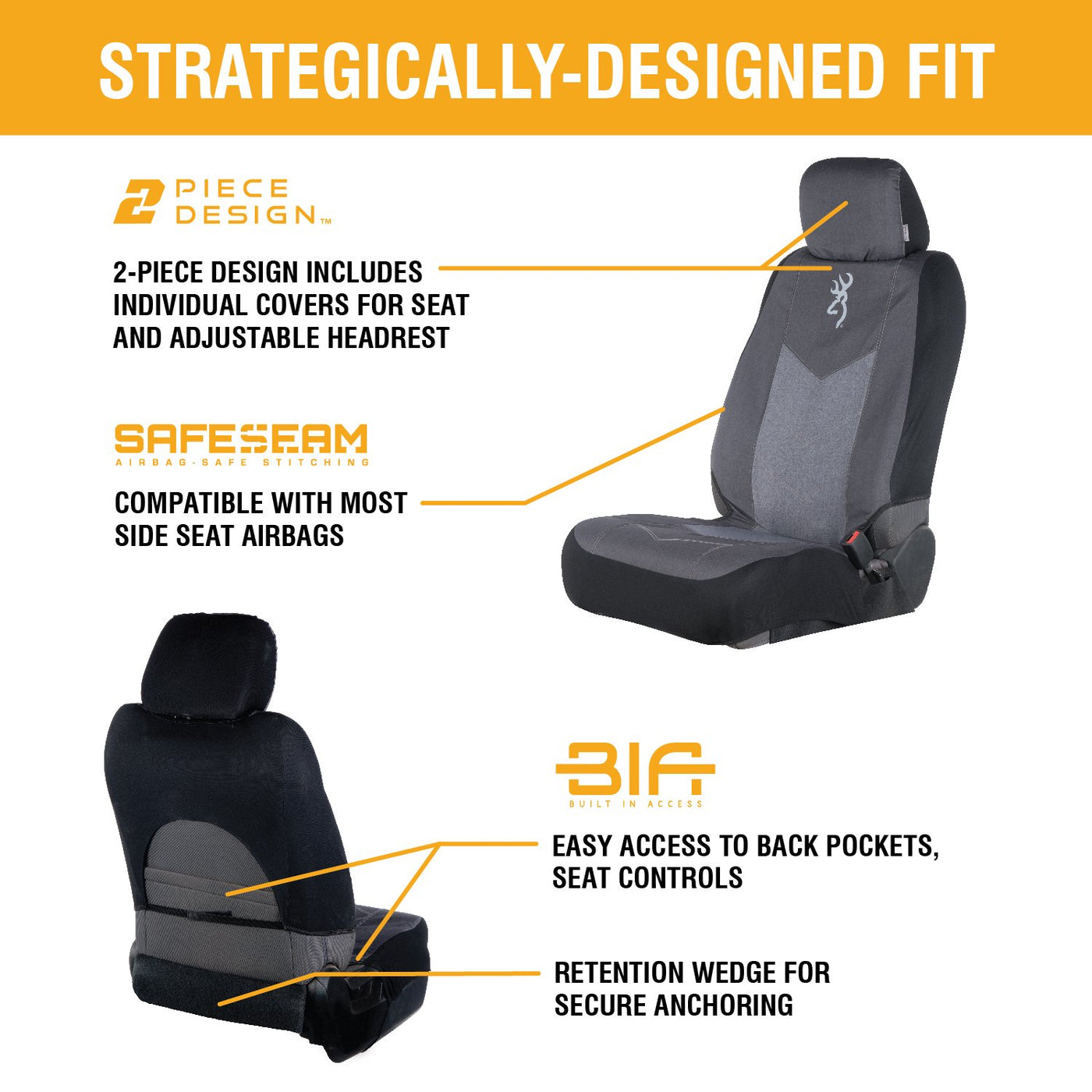 Q: What vehicles are compatible with the Browning Universal Front and Bench Seat Covers?A: The Browning Universal Front and Bench Seat Covers are designed to fit low back seats with a separate headrest. They are not compatible with built-in seat belts or built-in headrests, making them suitable for most cars, trucks, and SUVs that meet these specifications.
