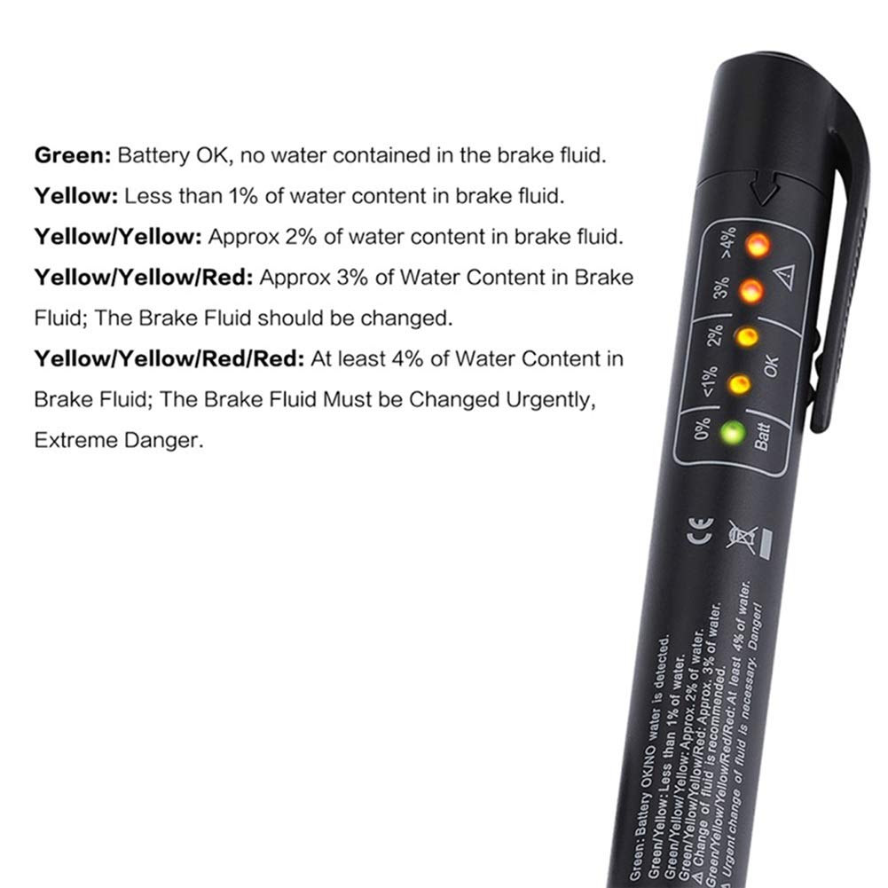 The tester can be used as a digital brake fluid tester suitable for determining brake fluid quality. Developed for professional use in astomotive repair shops and in servicing. Quality is tested and included on five LEDs in terms of ''per cent of water in the brake fluid . '' Ready for Brake Fluid Test Unscrew the brake fluid reservoir, and pull off the cap of the Brake fluid tester.Dip the test probes into the brake fluid up to the plastic rim of the device. To check Fluid Quality Press the button for power on, green LED will light up. Insert the tester into reservoir for one second then the tester result will be correctly indicated by LEDs.Repress the button for power off. The tester will automatically power off after about 15 seconds of inactivity. Tester Specification: 1. To check the quality of brake fluid quality 2. 5 LEDs to indicate percentage of water in the brake fluid 3. Automatically power off 4. Operated by a LR03 AAA 1.5V battery (Not included) Tester Instructions: Brake fluid detection pen is based on the change in conductivity to determine the moisture change brake fluid. It shows clearly the extent of moisture contained by the light-emitting diode, high moisture content will lead to lower boiling point, affect braking performance. Red indicates the brake fluid needs immediate replacement, green represents good condition, yellow indicates the state is acceptable but soon replaced. 1. the green LED lights = water content in the brake fluid H2O <1.5%, brake fluid qualified 2. the yellow LED lights = brake fluid water content H2O = 1.5% to 3%, can continue to use, test again six months later 3. the red LED lights = water content in the brake fluid H2O> 3%, can not continue to use the brake fluid needs to be replaced Red LED: change brake fluid Tester Features: Five LED indicators show1