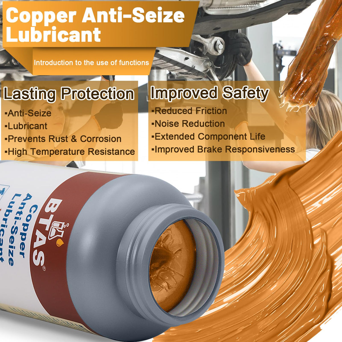 Btas Anti-Seize Lubricant Is A Premium Quality Copper Anti-Seize And Thread Lubricant,Prevents Threaded Parts From Seizing, Corrosion And Wear In Extreme Temperature Ranges, At High Or Low Temperatures Or High Pressures. This Anti-Seize Paste Contains A High Proportion Of Micro-Fine Copper Flakes And High-Quality Rust And Corrosion Inhibitors, Which Ensures That Threaded Parts Coated With Anti-Seize Paste Do Not Rust Or Corrode Under Wet Conditions, Facilitating Later Disassembly And Maintenance, As Well As Providing Good Electrical Conductivity. With A Temperature Range Of -30F To 1800F, This Copper Anti-Seize Grease Is Ideal For Automotive Applications Such As Hubs Parts, Brake Caliper Parts To Eliminate Noise And Prevent Water From Entering The Part, Which Can Lead To Rust And Corrosion,Maintaining Its Performance Even During High-Speed Driving Or Prolonged Braking. It Is Also Perfect For Spark Plug Threads, Exhaust Manifold Bolts, Engine Bolts, Oxygen Sensors, Detonation Sensors, Thermostat Housing Bolts, Fuel Filter Fittings, And Battery Cable Connections In A Wide Range Of Applications In The Automotive, Marine, Energy, And Manufacturing Industries.