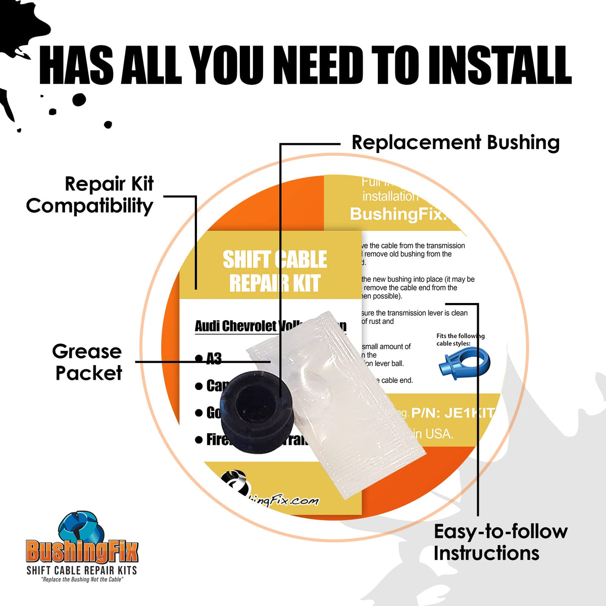Q: What does the BushingFix JE1Kit include?A: The BushingFix JE1Kit comes with everything needed to replace a damaged transmission shifter cable bushing, including a replacement bushing and a grease packet. This all-in-one kit simplifies the repair process without the need to replace the entire transmission cable.