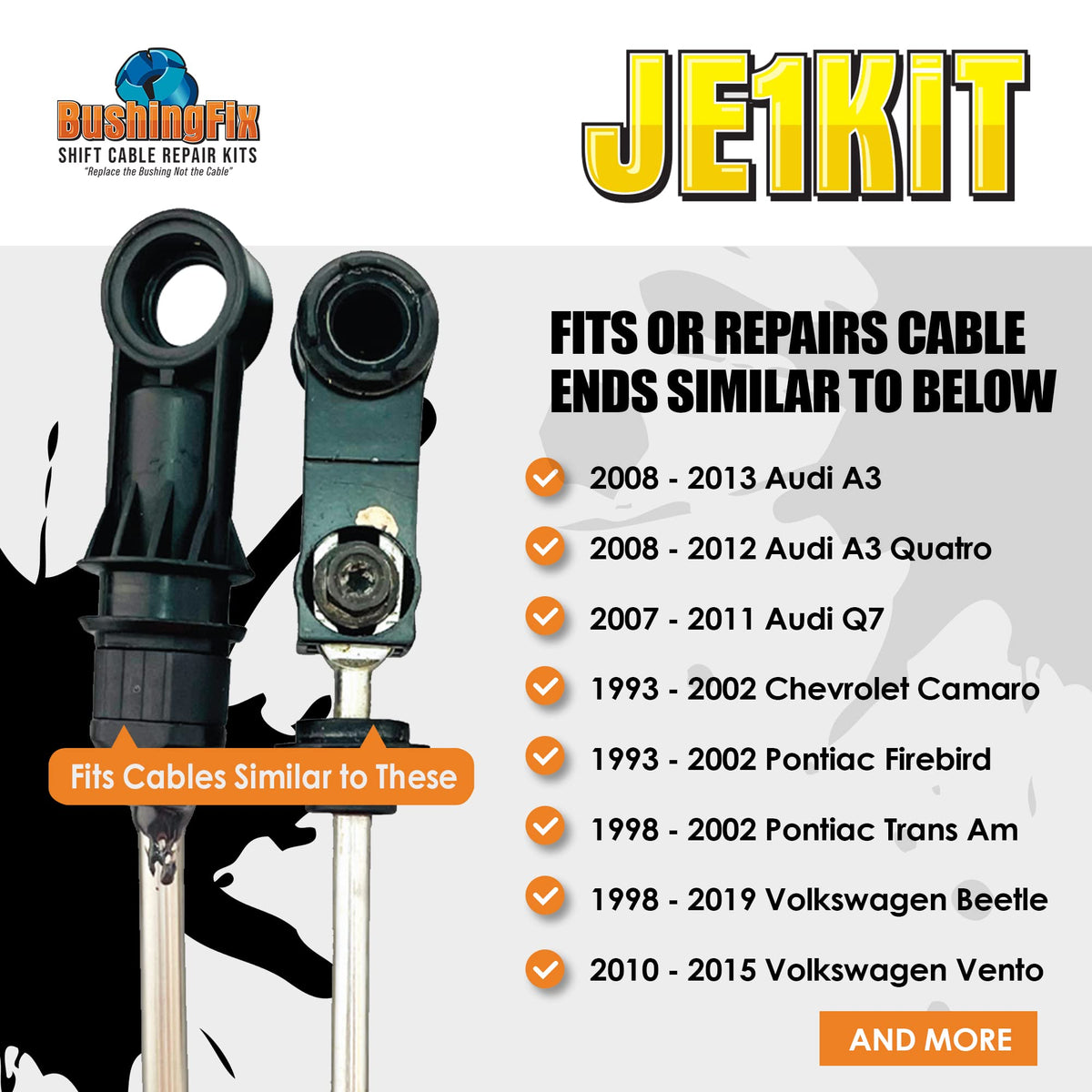 BushingFix Je1Kit Replacement Automatic Transmission Shift Cable Bushing Repair Kit comes with everything you need to replace your damaged transmission shifter cable bushing. Get the job done quickly, easily, and without the cost of having to replace the entire transmission cable! The kit comes with: a replacement bushing and grease packet. Our kit also includes text and video instructions along with reliable tech support to make the installation even easier. This bushing replacement fits: Beetle, Passat, A3, Jetta, Panamera, Camaro Cayenne, Tiguan, and many more.