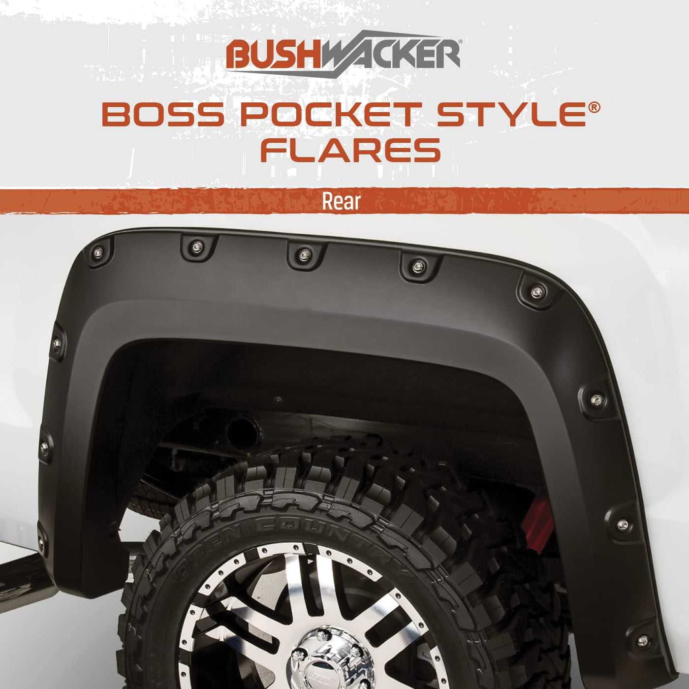 With their surface-mounted stainless steel bolts and massive presence, Boss Pocket Style Fender Flares are a Bushwacker exclusive. They're custom-designed for your truck to complement oversized tires and high-clearance lift kits.