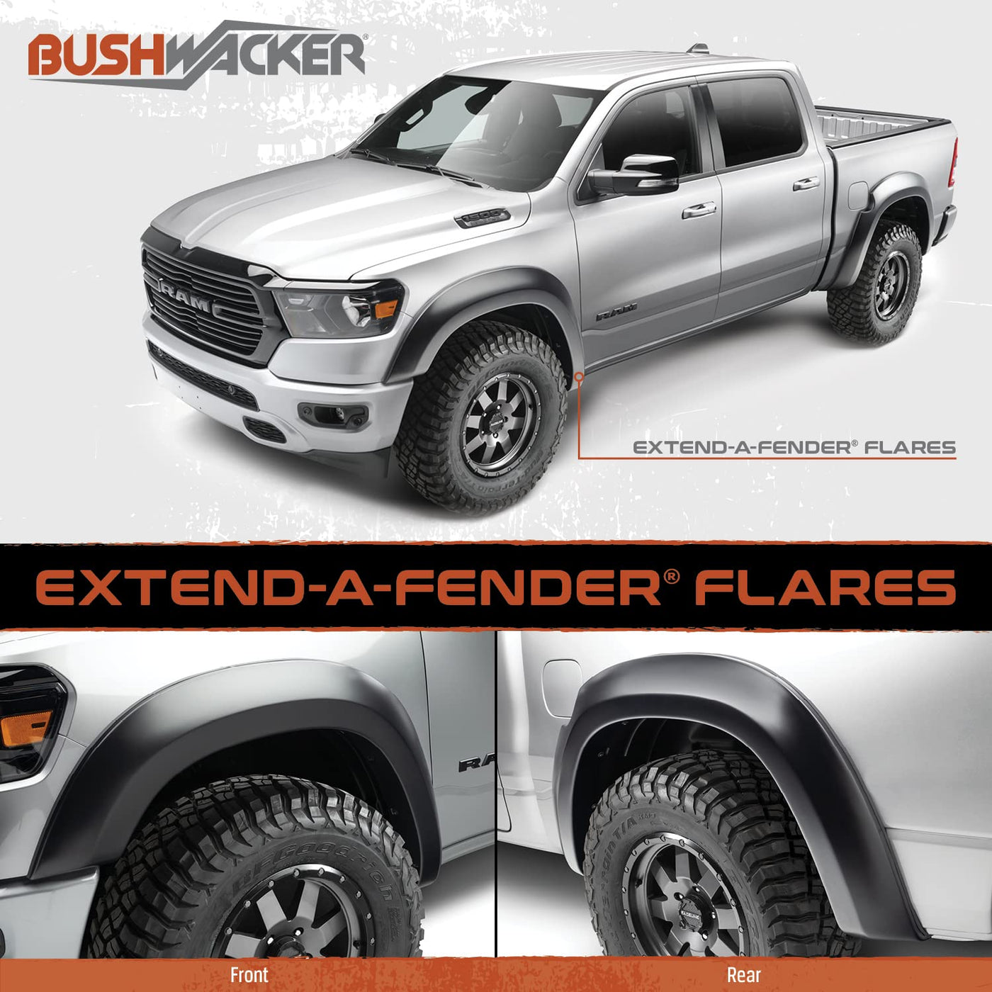Nothing improves the looks of a vehicle quicker than bolting on an oversize wheel & tire combination. Unfortunately, this can leave parts of your trucks body exposed to potential damage from road hazards, not to mention putting you in violation of the law in many states. Bushwacker Extend-A-Fender Flares are the ideal solution for adding a little extra coverage for those larger tires, without the bulky look of an off-road style flare. Precision designed to install in just minutes and built to stand the test of time, with durable Dura-Flex 2000 ABS construction. They are flexible, UV-resistant and impervious to impacts for a lifetime of worry-free use. Did we mention how great they look? .