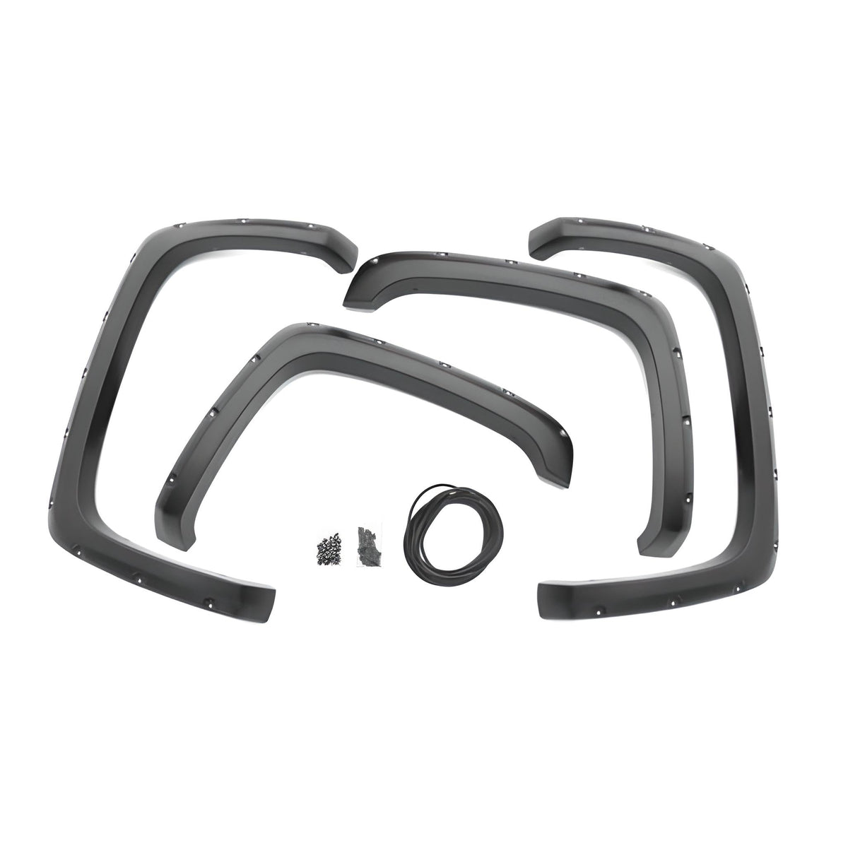Want A New Take On A Bushwacker Original? Check Out The New Bushwacker Forge® Fender Flares With A Rugged Texture And All Black Hardware. New To The Bushwacker Line Up These Flares Offer The Popular Rivet Style With A Rugged Textured Finish Unlike The Smooth Paintable Surface On Our Iconic Pocket Style Flares. The New Forge Flare Comes With Black Rivet Hardware To Highlight The Look Of A Bolted-On Flare. These Flares Complement Oversized Tires While Providing Tire Protection. Made With Our Durable Abs Material It Provides A Dense, Hard And Scratch-Resistant Surface, Flexible Enough To Bend Without Breaking.