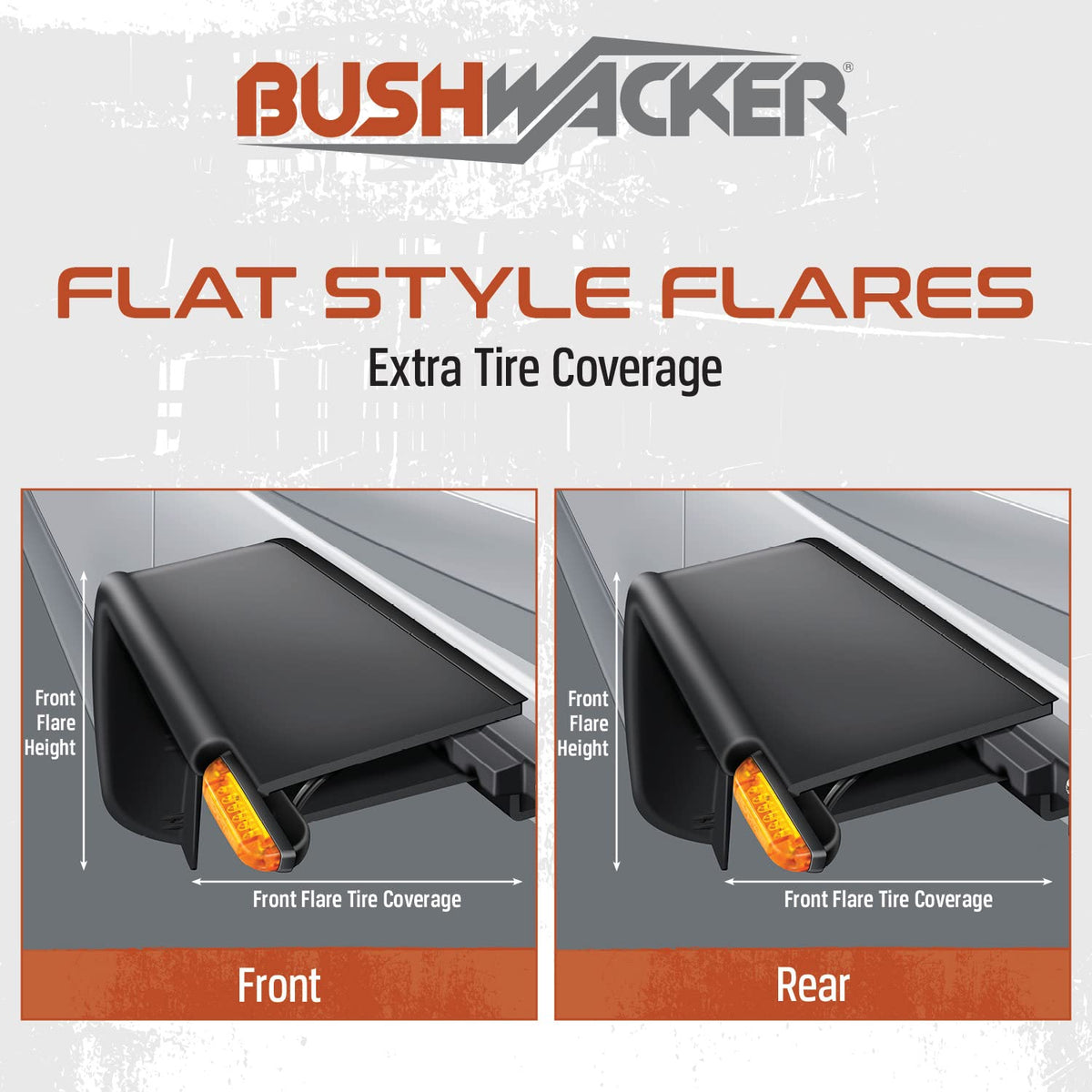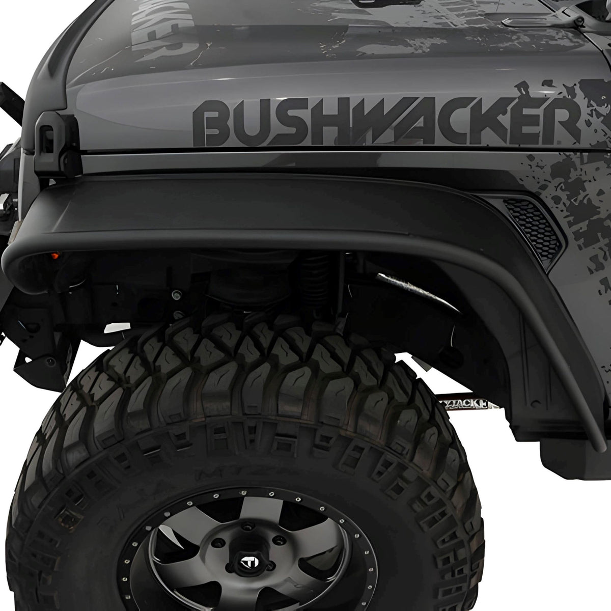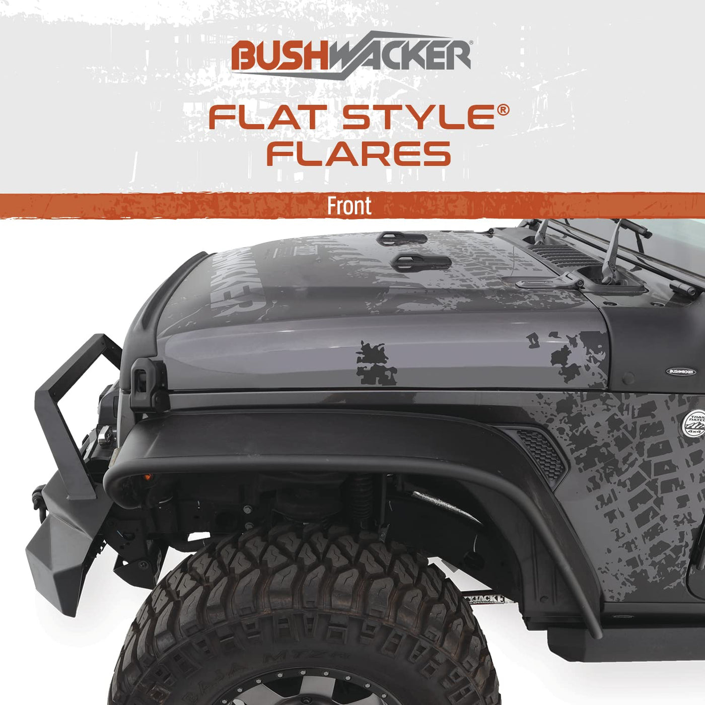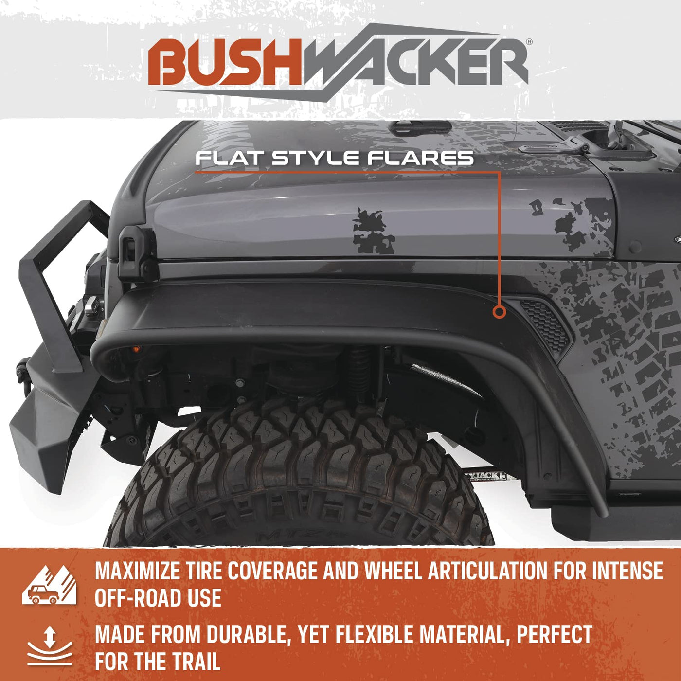 Q: How do these fender flares enhance my Jeep's performance?A: The Bushwacker Flat Style Fender Flares provide increased tire coverage and clearance, allowing for larger wheel and tire packages and improved suspension articulation during off-road driving.