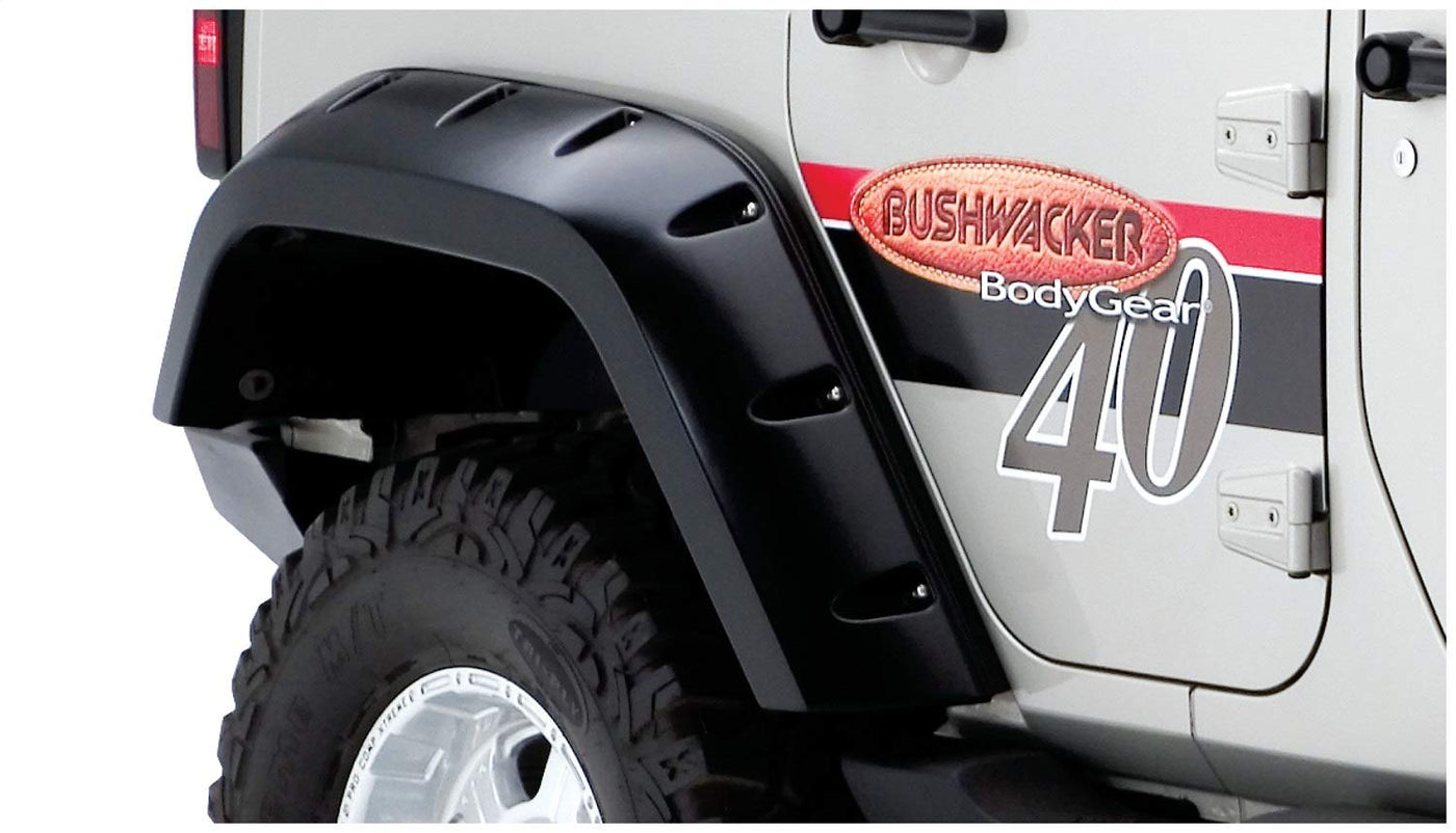 Q: What vehicles are compatible with the Bushwacker Max Coverage Fender Flares?A: The Bushwacker Max Coverage Pocket/Rivet Style Rear Fender Flares are specifically designed to fit 2007-2018 Jeep Wrangler JK Unlimited models, ensuring a perfect fit and optimal performance.