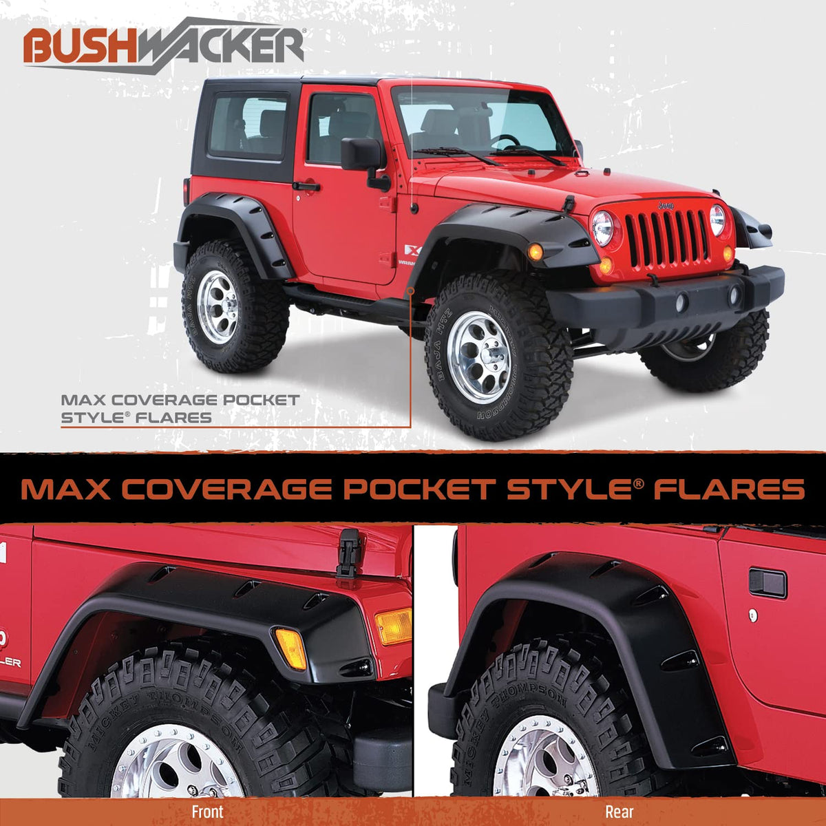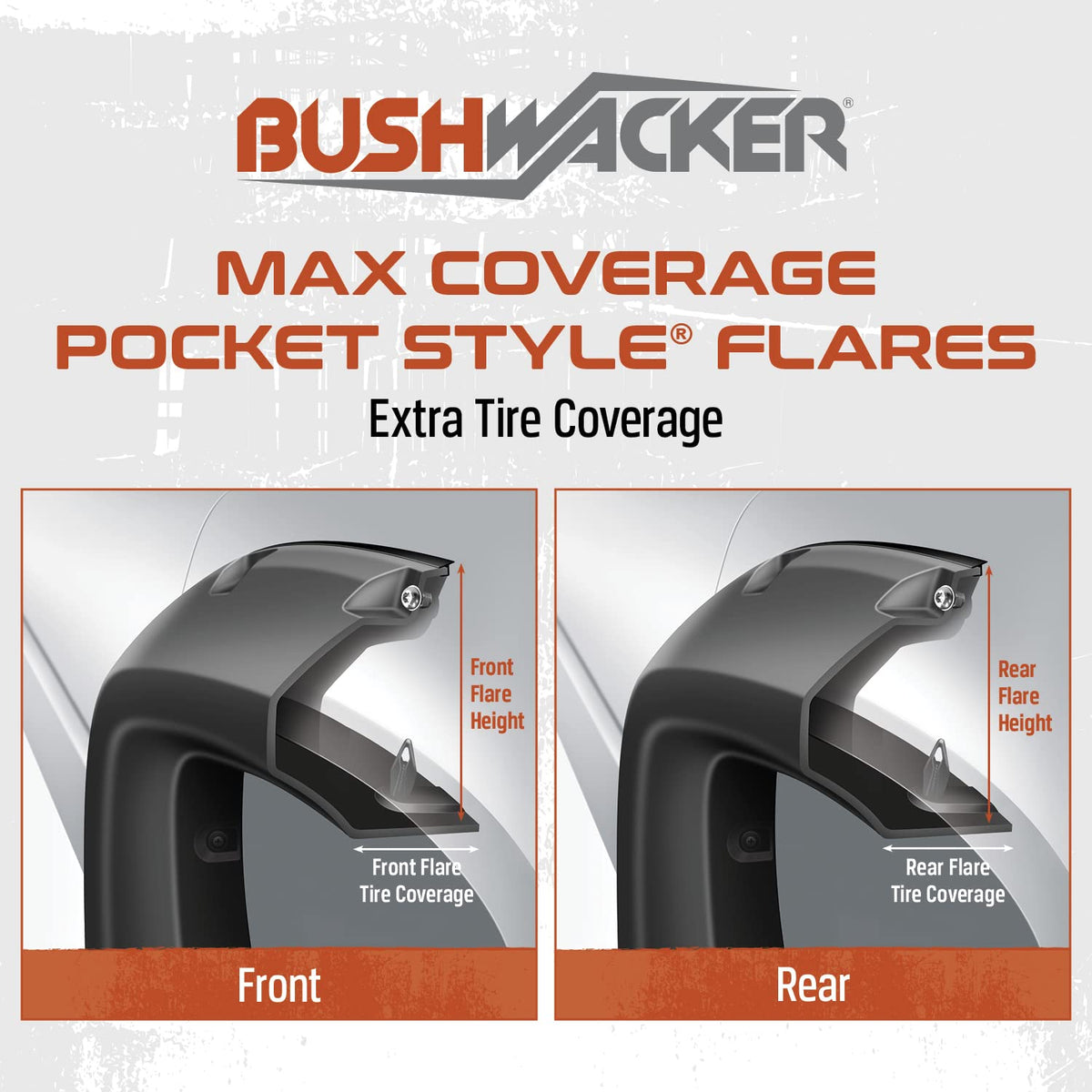Bushwacker Fender Flares Are Made To Be Flexible Enough To Withstand Any Environment You Put Them In. From The Debris On The Roads To The Brush On The Trails And Any Other Elements That Wear On Them Every Day, Bushwacker Flares Are Designed To Never Relent To Punishment And Maintain Their Style. Max Coverage Pocket Style Fender Flares Provides More Tire Coverage Than Standard Pocket Style Flares, The Max Coverage Pocket Style Fender Flares Are Rugged, Easy To Install, And Perfect For Vehicles With Big Tires And Wide Wheels. Made With Complete Uv Protection For The Ultimate Maximum Coverage.
