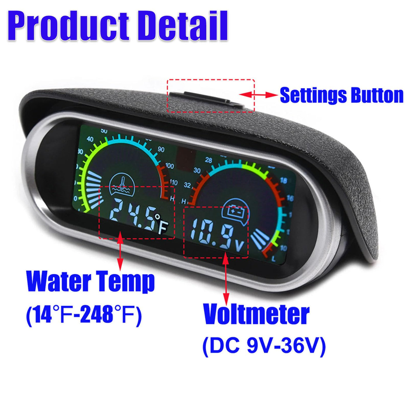 Specifications: Color: Black Material: ABS + Metal Voltage: 9-36V Temperature Measuring Range: 14-248? Voltage Measuring Range: 9-36V Package included: 1x Water Temperature & Voltmeter Gauge Kit
