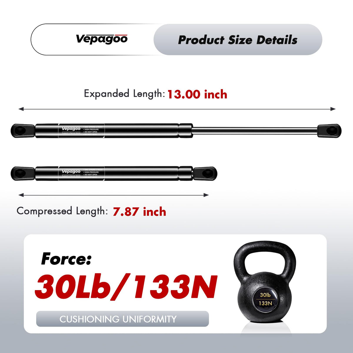 ?13 inch Struts for Truck?Extended length: 13 inch, Force: 30lbs Per Strut. Compatible with Leer ARE Snugtop truck camper shell, topper rear window, truck cap canopy, pickup truck toolbox | ?Interchange Numbers?711498, C1604464, C16-04464, C1621703, C16-21703, CS130030, CS1300-30, SE130P30 | ?5-mins Installation?Swap out your old strut in your garage-grab a head screwdriver. Unscrew the worn parts, then snap the new strut into your vehicle's original mounting points as easily as building with blocks | ?Stable Support & Effortless Control?Lift camper shell, or toolbox lids with one hand-no more wrestling heavy; A smooth, cushioned motion silences jarring metal clangs, while preventing dangerous sudden pops or slams | ?Professional Support?Our team guarantees 24-hour email responses for personalized help with installations, product selection, or questions. Enjoy 18-month full order protection