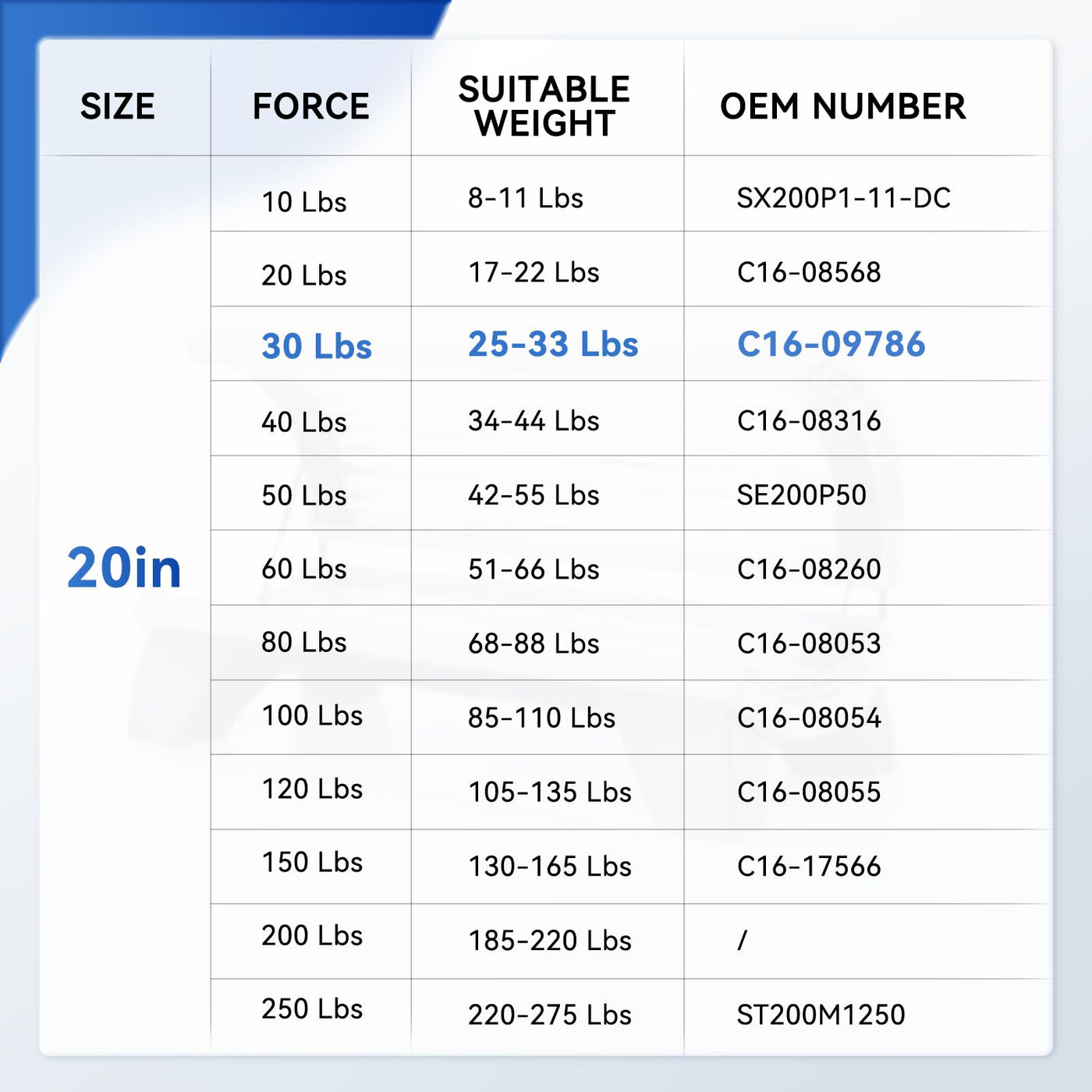 Detailed Parameters: Extended Length (Center-To-Center): 19.7 '' (500 Mm); Compressed Length (Center-To-Center): 12.2 '' (310 Mm); Force 30 Lbs (133 N) Per Strut, 2 Struts Included In Per Set; Interchange Number: C16-09786 C1609786 | Application Range: Most Suitable Support Weight Is Between 23 Pounds And 33 Pounds, If Out Of This Range, We Suggest You Buy Other-Pressure Struts. Note: Do Not Compress Them By Hands Before Installing, The Struts Could Only Be Compressed After Installing Successfully | Multi-Scenario Usage: The Gas Struts Can Be Used As The Replacement Parts Of The Rv Door, Motorhome Door, Tonneau Cover, Truck Cap And Also Can Be Used On Trailer Lid, Boat Engine Compartment Covercamper Window Shell, Light Window, Storage Box Lid | Package Content: 2