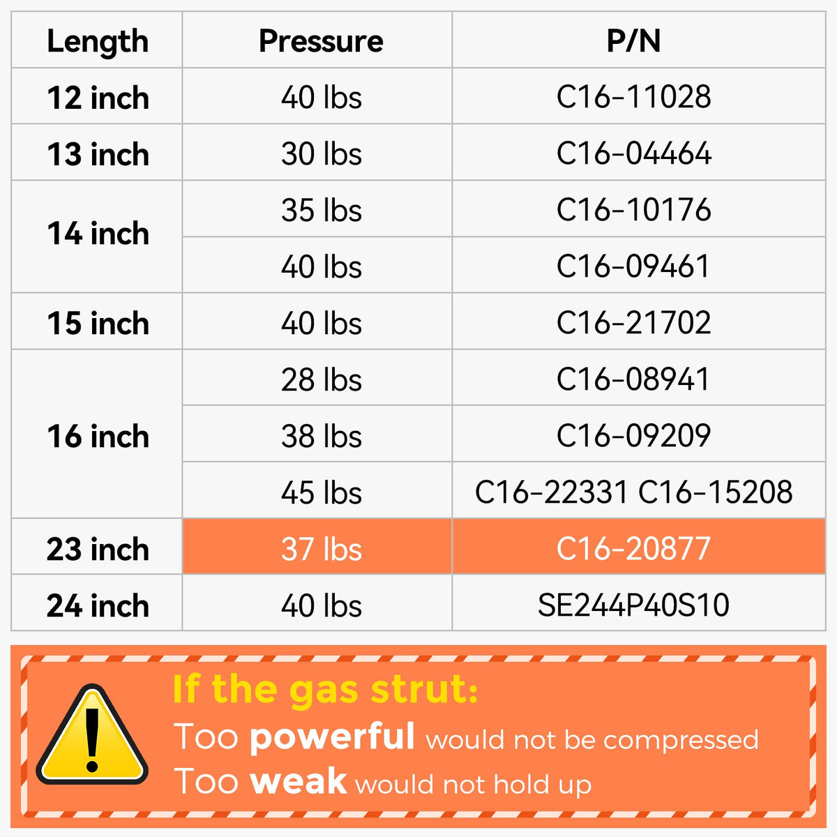 ?23 Inch Gas Strut???Extended Length: 22.87 Inch, Compressed Length: 13.00 Inch. 37 Lb / 165 N Per Strut, 2 Pack. Package Information: 23 Inch 37 Lbs Gas Prop Strut X 2; ?23 Inch Gas Shock???Lift-O-Mat Spring Strut Lift For Rv Motorhome Side Bay Door, A.R.E Leer Camper Shell, Pickup Truck Cap Topper, Canopy Glass Door Hatch, Back Window, Bed Cover, Replacement Shocks, Etc. ?23 Inch Gas Spring???Interchange Part Number: C1620877, C16-20877. ?Leer Camper Shell Gas Shock???If The Weight And The Pressure Of The Gas Strut Do Not Match, The Gas Strut May Not Work Properly, Please Select The Appropriate Gas Strut According To The Original Part Number And Pressure Value. Note: The Gas Struts Can Not Be Compressed By Hands Before Installation!!! ?Canopy Truck Gas Strut???180,000 Times -Passed Tuv Fatigue Test. Pamagoo Choose Special Low-Temperature-Resistant Materials, Working Temperature: -40?~60 ?/-40?~140?. Pamagoo Will Provide You With Professional Customer Service Both Before And After Your Purchase And Offer 18-Months Support Service. We Have Gas Spring Installation Videos And Online Service To Guide Quick Installation In Minutes. After Successful Installation, The Door/Window Can Be Lifted Easily.