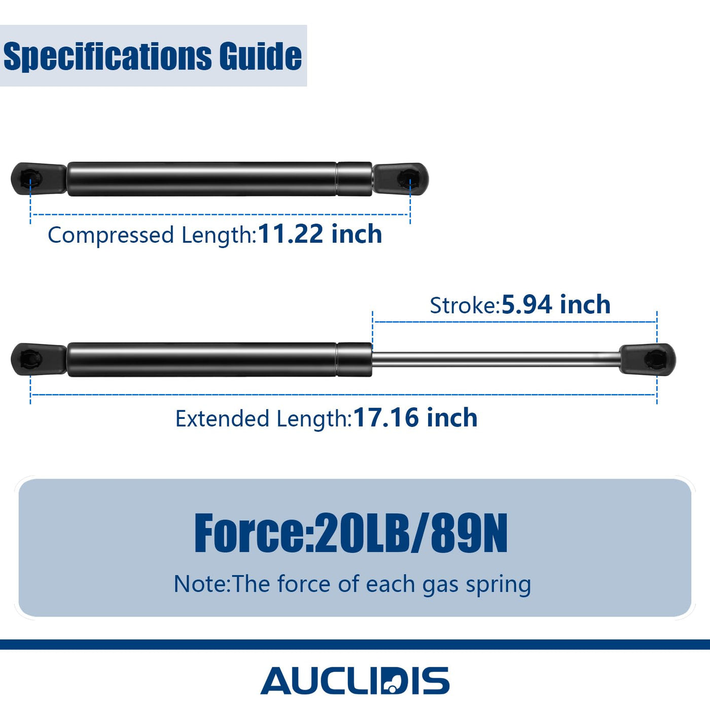 Q: What are the specifications of the 17 inch gas strut?A: The 17 inch gas strut has an extended length of 17.16 inches and a compressed length of 11.22 inches. It features a nylon ball socket connection of 10mm at both ends and provides a force of 20lb/89N.